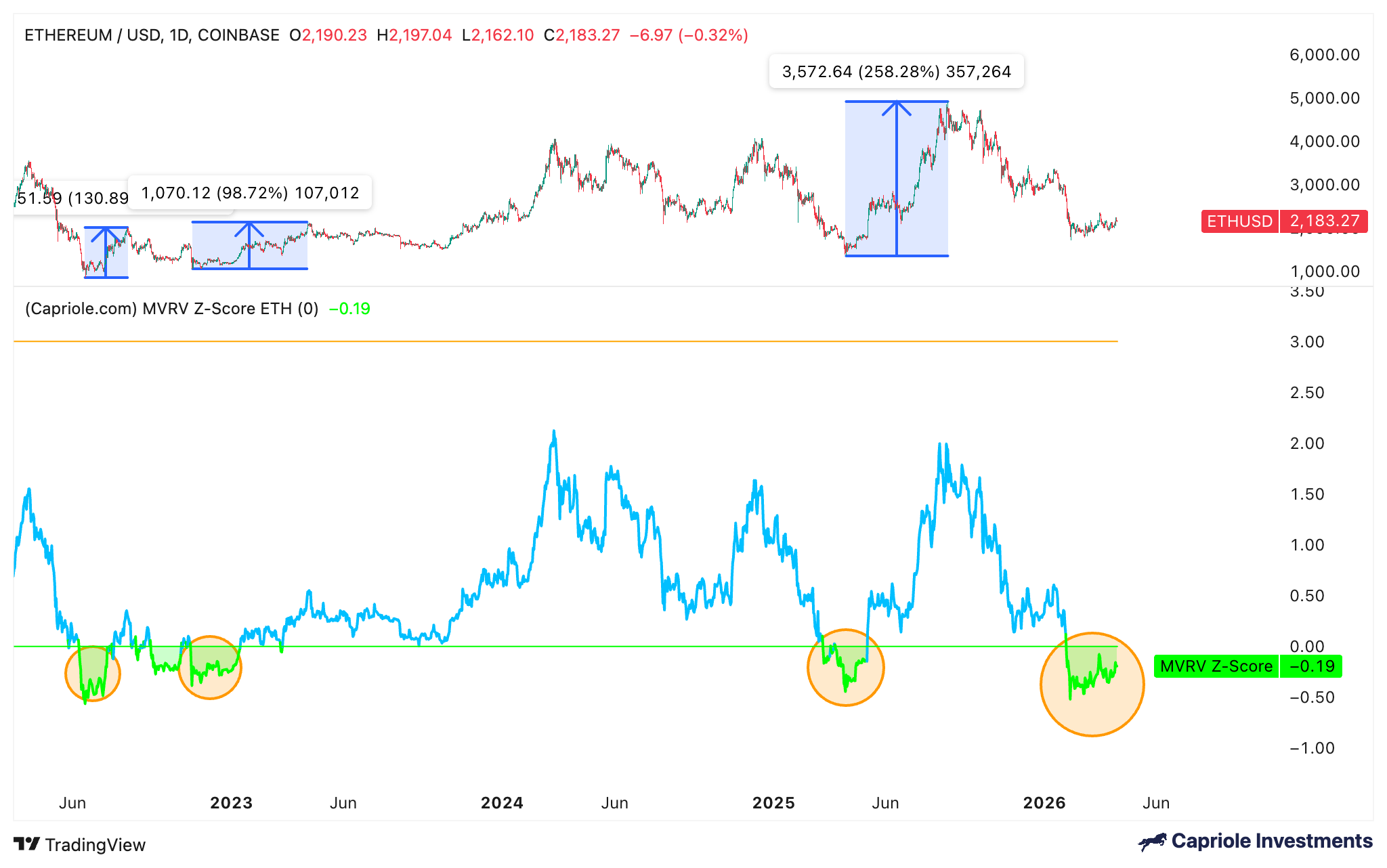 آخر مرة انخفضت فيها درجة MVRV Z لـ Ether إلى المستويات الحالية كانت في أبريل 2025، بعد انخفاض السعر بنسبة 66٪. وتزامن ذلك مع قاع السوق الكلي عند 1400 دولار وسبق ارتفاعًا استمر عدة أشهر، مع ارتفاع زوج إيثريوم/دولار بنسبة 258% إلى أعلى مستوى حالي له على الإطلاق عند 4950 دولارًا.