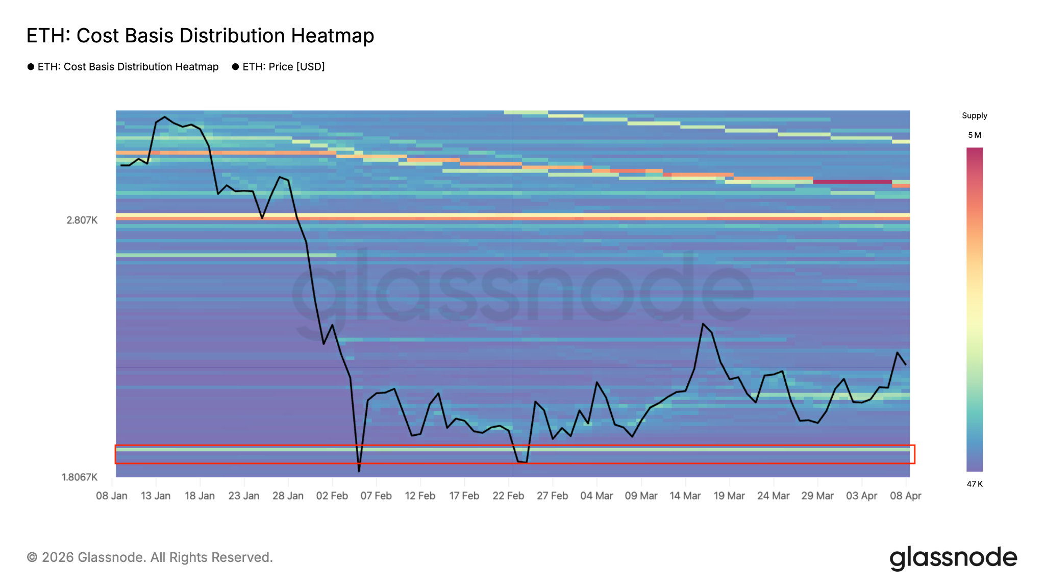 هذه هي المنطقة التي تبلغ حوالي 1800 دولار، حيث حصل المستثمرون على أكثر من 1.35 مليون إيثريوم، وفقًا لخريطة التوزيع الحرارية على أساس التكلفة الخاصة بـ Glassnode.