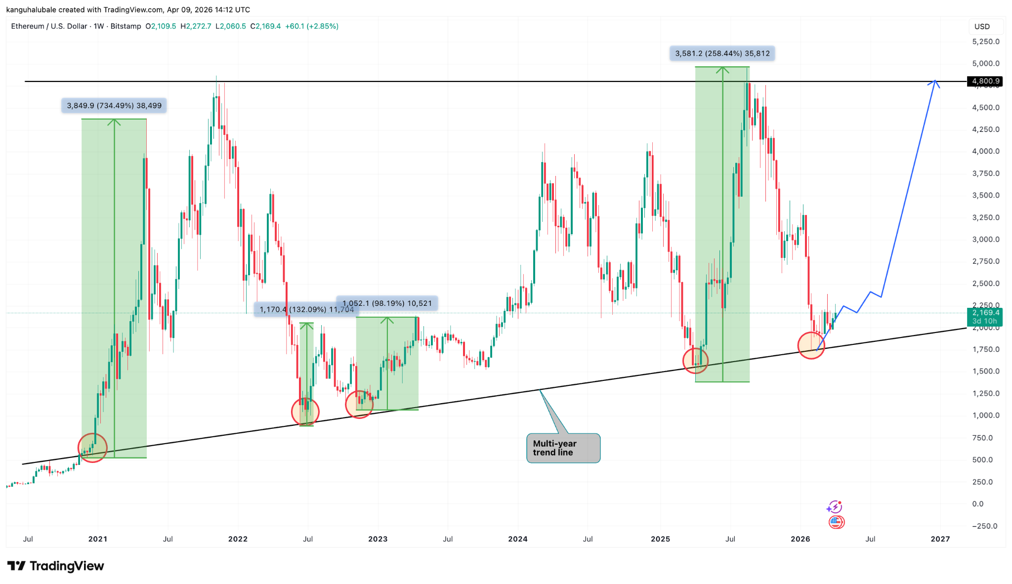 ارتد سعر ETH من خط الاتجاه لعدة سنوات والذي يمثل أدنى مستوياته الكلية السابقة.
