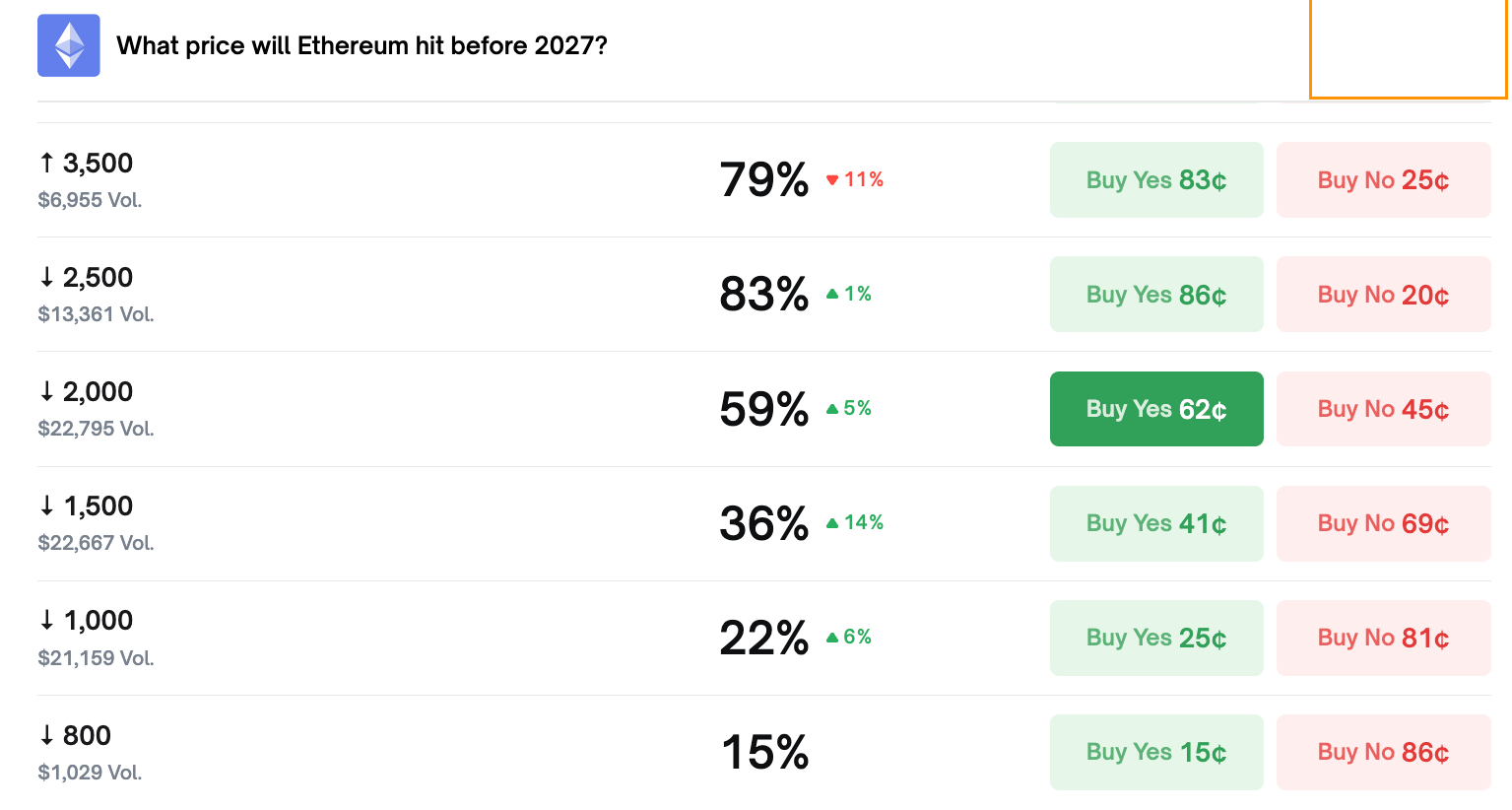 على الرغم من أن المراهنين في Polymarket يقدرون فرصة بنسبة 11٪ فقط لانخفاض سعر ETH إلى 2000 دولار – 2200 دولار قبل نهاية عام 2025، إلا أنهم يرون فرصة بنسبة 83٪ لعودة سعر إيثريوم إلى 2500 دولار وفرصة بنسبة 59٪ لانخفاضه إلى 2000 دولار في عام 2026.