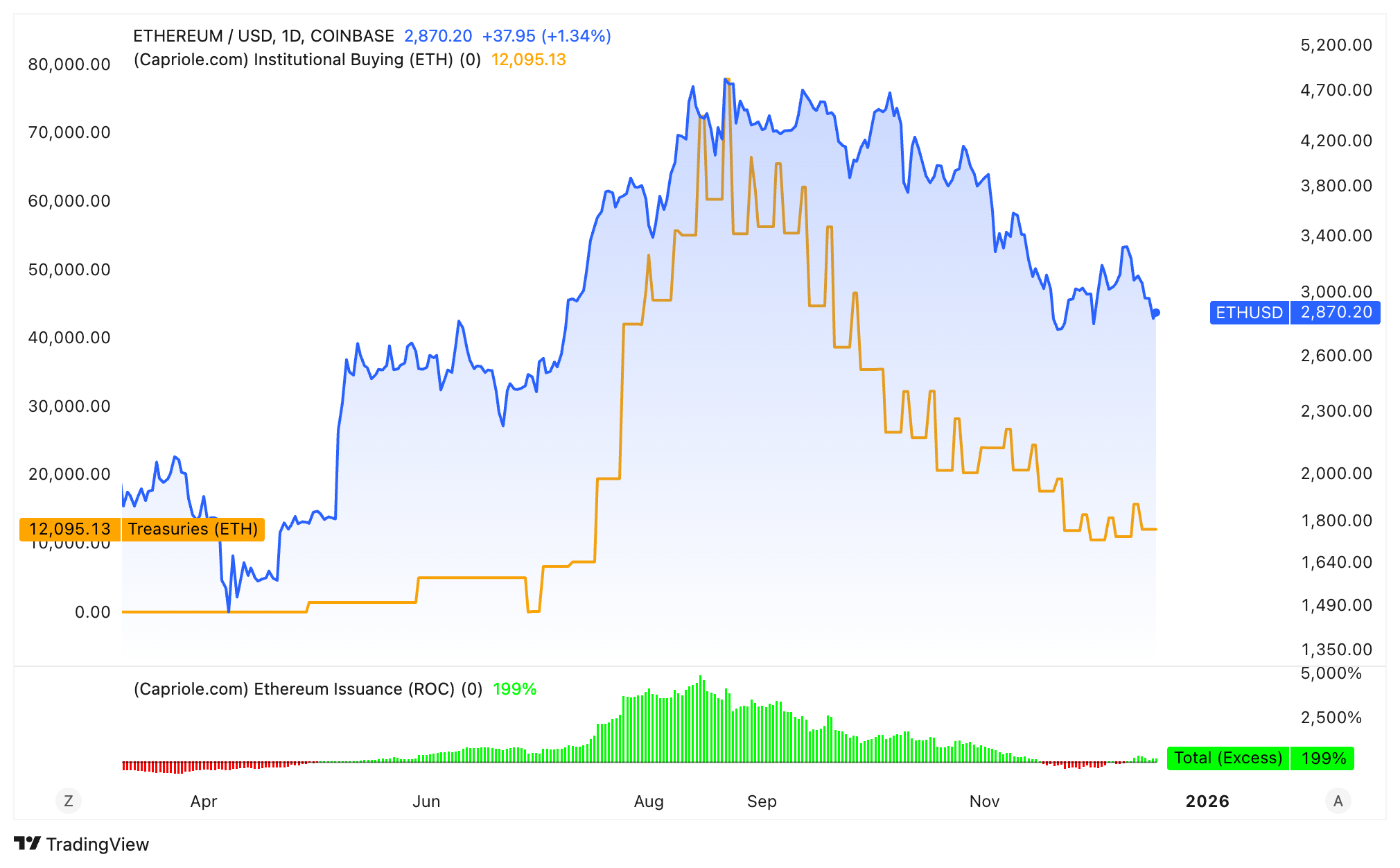 تكشف بيانات إضافية من Capriole Investments أن المشتريات اليومية لشركات خزينة Ethereum قد انخفضت من ذروة بلغت 78,010 ETH في 23 أغسطس إلى 12,095 ETH يوميًا.