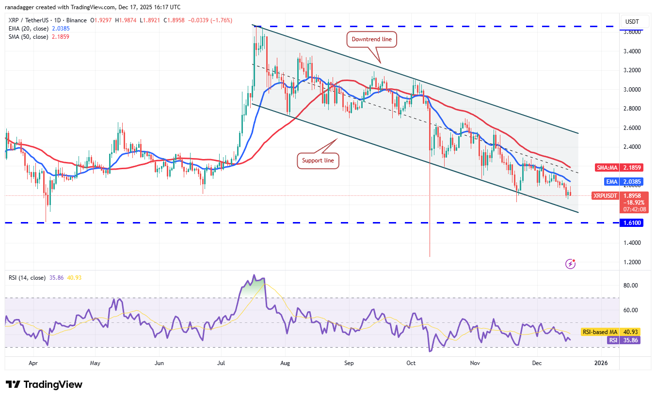 تنزلق XRP (XRP) نحو خط الدعم لنمط القناة الهابطة، مما يشير إلى معنويات سلبية.