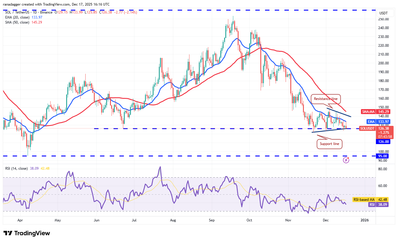يشير المتوسط المتحرك لـ 20 يومًا المنحدر (133 دولارًا) ومؤشر القوة النسبية (RSI) أقل من 39 إلى أن المضاربين على الانخفاض هم المسيطرون. ويشير الإغلاق تحت خط الدعم إلى استمرار الحركة الهبوطية. يمكن أن ينخفض زوج SOL/USDT إلى 110 دولارات ثم إلى الدعم القوي عند 95 دولارًا، حيث من المتوقع أن يتدخل المشترون.