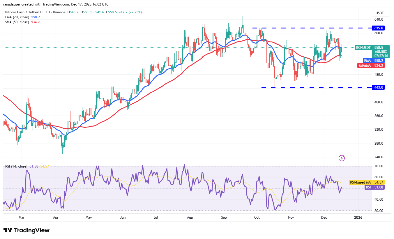 إذا فشل السعر في البقاء فوق المتوسط المتحرك لـ 20 يومًا، فسيحاول البائعون مرة أخرى سحب زوج BCH/USDT إلى ما دون المتوسط المتحرك البسيط لـ 50 يومًا. إذا نجحوا، فقد ينخفض سعر Bitcoin Cash إلى ما دون مستوى الدعم البالغ 508 دولارًا. ويشير ذلك إلى إجراء محدد النطاق بين 443 دولارًا و615 دولارًا لبعض الوقت.