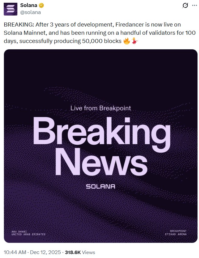 قالت مؤسسة سولانا يوم ١٢ ديسمبر إن شركة Firedancer كانت تنتج الكتل على الشبكة الرئيسية لأكثر من 100 يوم خارج بيئات الاختبار.