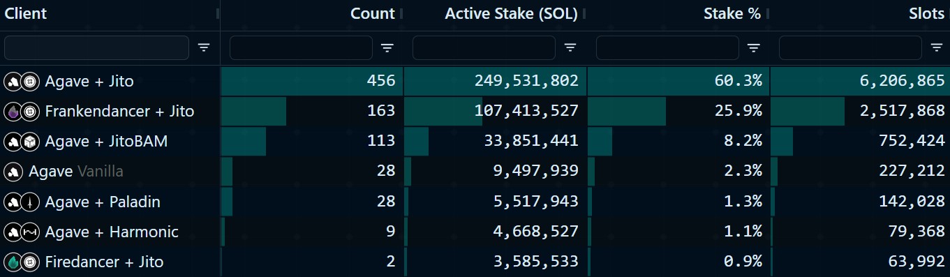 يقوم حاليًا اثنان من المدققين بتشغيل عميل Firedancer الكامل، ولكن الإصدار المختلط المعروف باسم “Frankendancer” شهد اعتمادًا أوسع بكثير. تشير البيانات إلى أن ما يقرب من 165 مدققًا، يمثلون حوالي 26% من إجمالي الحصة، يديرون الآن Frankendancer جنبًا إلى جنب مع عميل Agave الحالي.