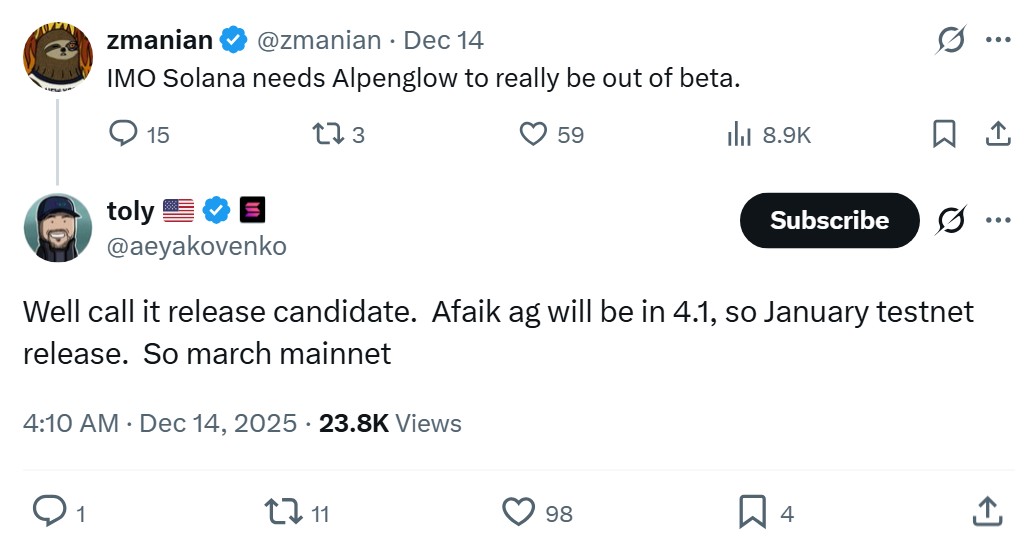 إلى جانب Firedancer، يستعد مطورو Solana أيضًا لـ Alpenglow، وهو إصلاح شامل مقترح لتصميم Solana المتفق عليه. ستحل الترقية محل إثبات التاريخ وTowerBFT لخفض مدة الكتلة النهائية إلى ما يقرب من 150 مللي ثانية مع تحسين قدرة الشبكة على البقاء على قيد الحياة حتى لو كان جزء من المدققين لا يستجيبون.