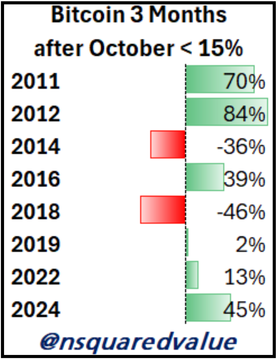 “يبلغ متوسط عائد بيتكوين لمدة ثلاثة أشهر بعد شهر أكتوبر الضعيف 11٪ (2016-)؛ أما بالنسبة لشهر أكتوبر القوي، فهو 21٪.”