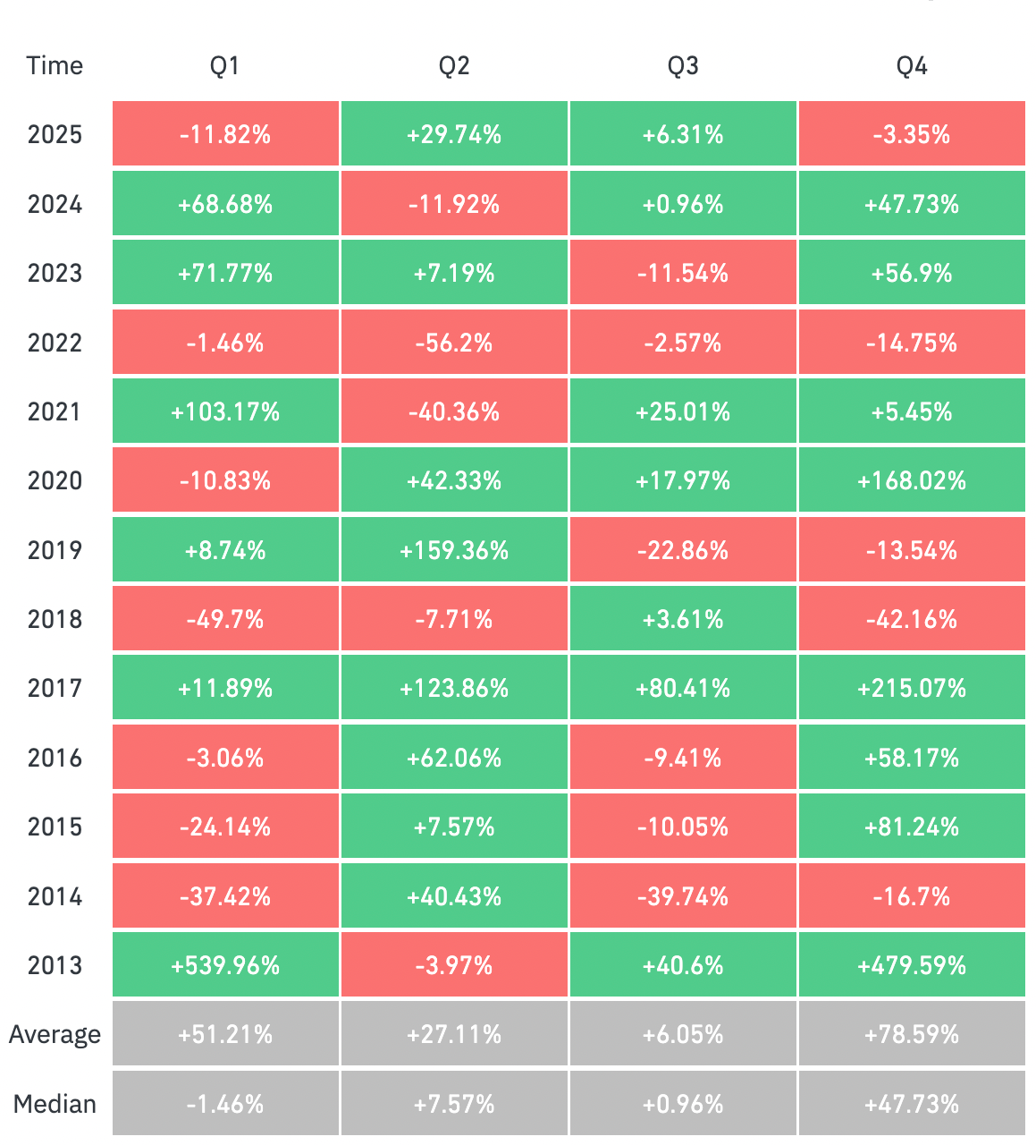 نوفمبر هو أفضل شهر تاريخيًا للبيتكوين، حيث بلغ متوسطه 46% على مدار 12 عامًا اعتبارًا من عام 2013. وهذا يجعل الفترة بين أكتوبر وديسمبر أفضل ربع لارتفاع أسعار البيتكوين، مع متوسط مكاسب بنسبة 78%، وفقًا لبيانات من CoinGlass.