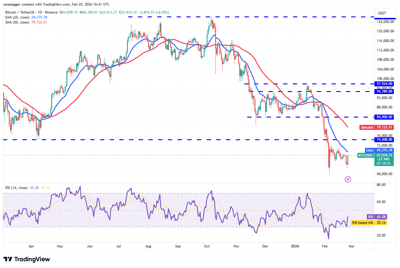 سيحاول المشترون دفع سعر البيتكوين فوق المتوسط المتحرك الأسي لمدة 20 يومًا (69,375 دولارًا). إذا نجحوا، فقد يرتفع زوج BTC/USDT إلى مستوى الانهيار عند 74,508 دولار، حيث من المتوقع مرة أخرى أن يقوم المضاربون على الانخفاض بدفاع قوي.