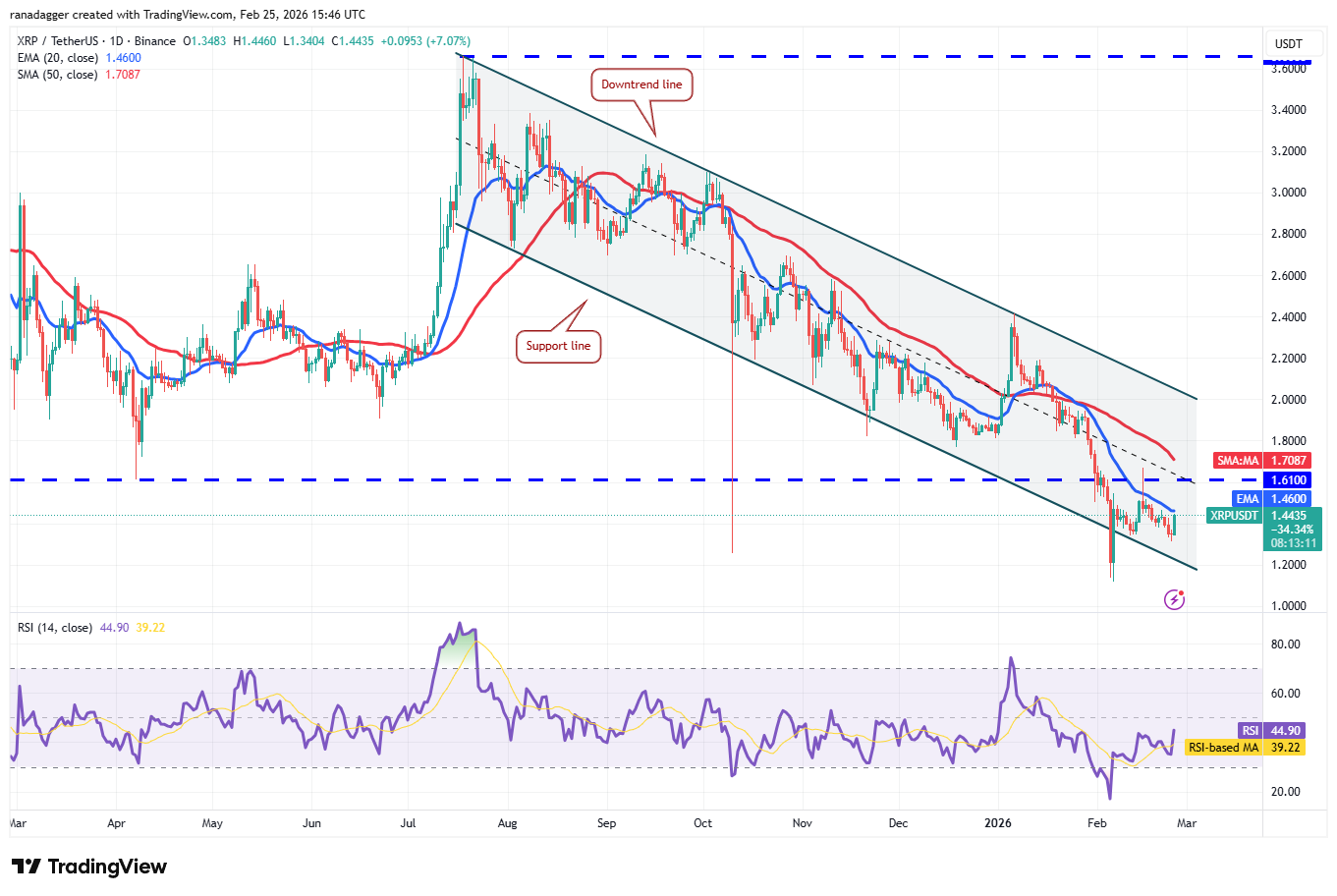 إذا أغلق سعر XRP فوق المتوسط المتحرك لـ 20 يومًا، فقد يرتفع زوج XRP/USDT إلى المتوسط المتحرك البسيط لـ 50 يومًا (1.70 دولارًا) وفي النهاية إلى خط الاتجاه الهبوطي. سيتعين على المشترين تجاوز العقبة عند خط الاتجاه الهبوطي للإشارة إلى تغيير محتمل في الاتجاه.