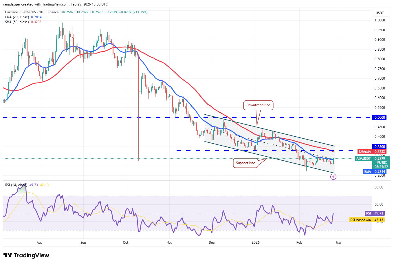 يحاول المشترون العودة من خلال الحفاظ على سعر Cardano أعلى من المتوسط المتحرك الأسي على مدى ٢٠ يومًا (٠,٢٨ دولارًا). إذا تمكنوا من القيام بذلك، فقد يرتفع زوج ADA/USDT إلى خط الاتجاه الهبوطي.