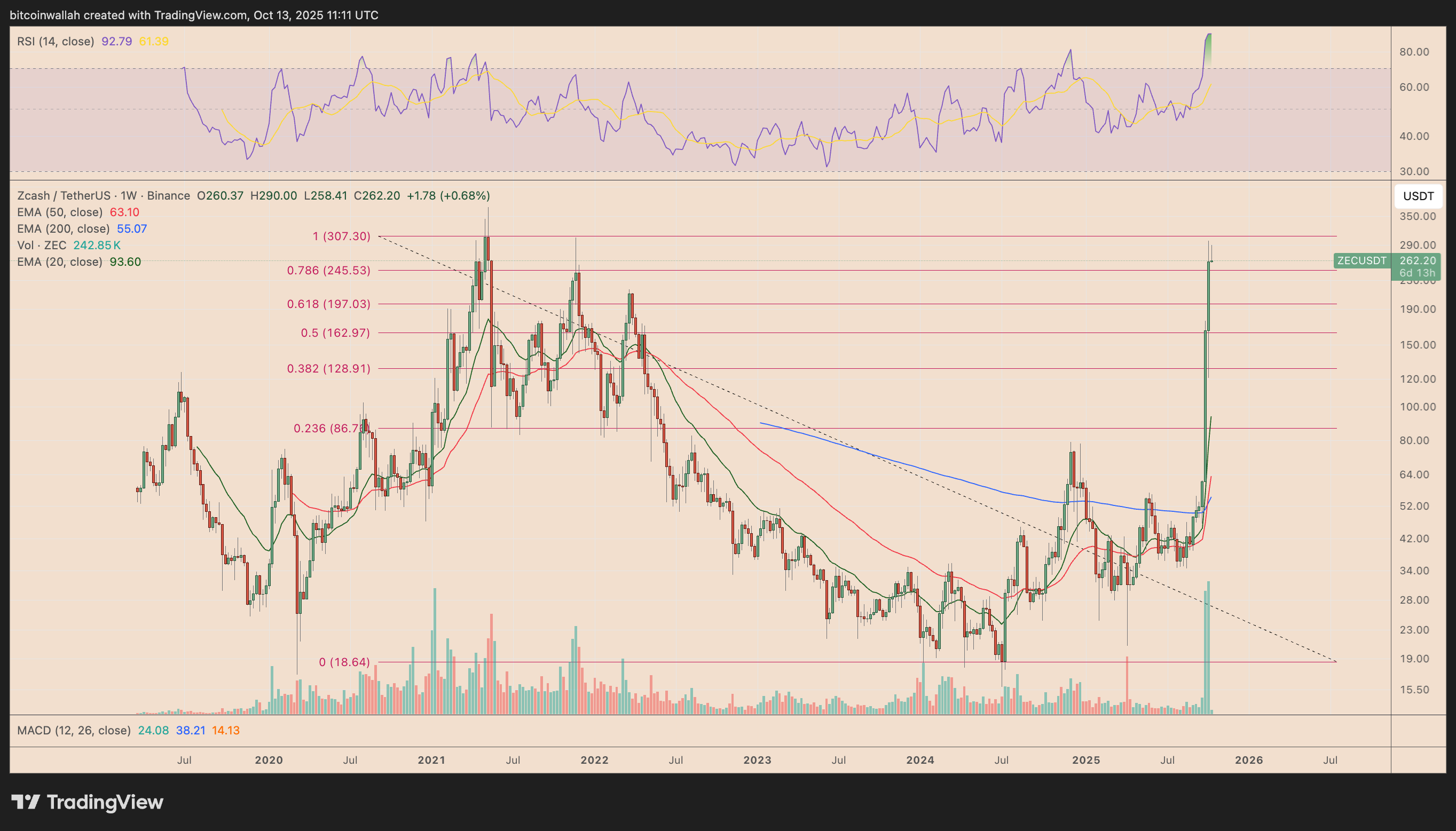 ارتفعت Zcash (ZEC) بأكثر من 520٪ في الشهر الماضي، حتى أنها تتحدى عمليات بيع العملات المشفرة الأوسع نطاقًا والتي قضت على 20 مليار دولار من مراكز الرافعة المالية خلال عطلة نهاية الأسبوع.