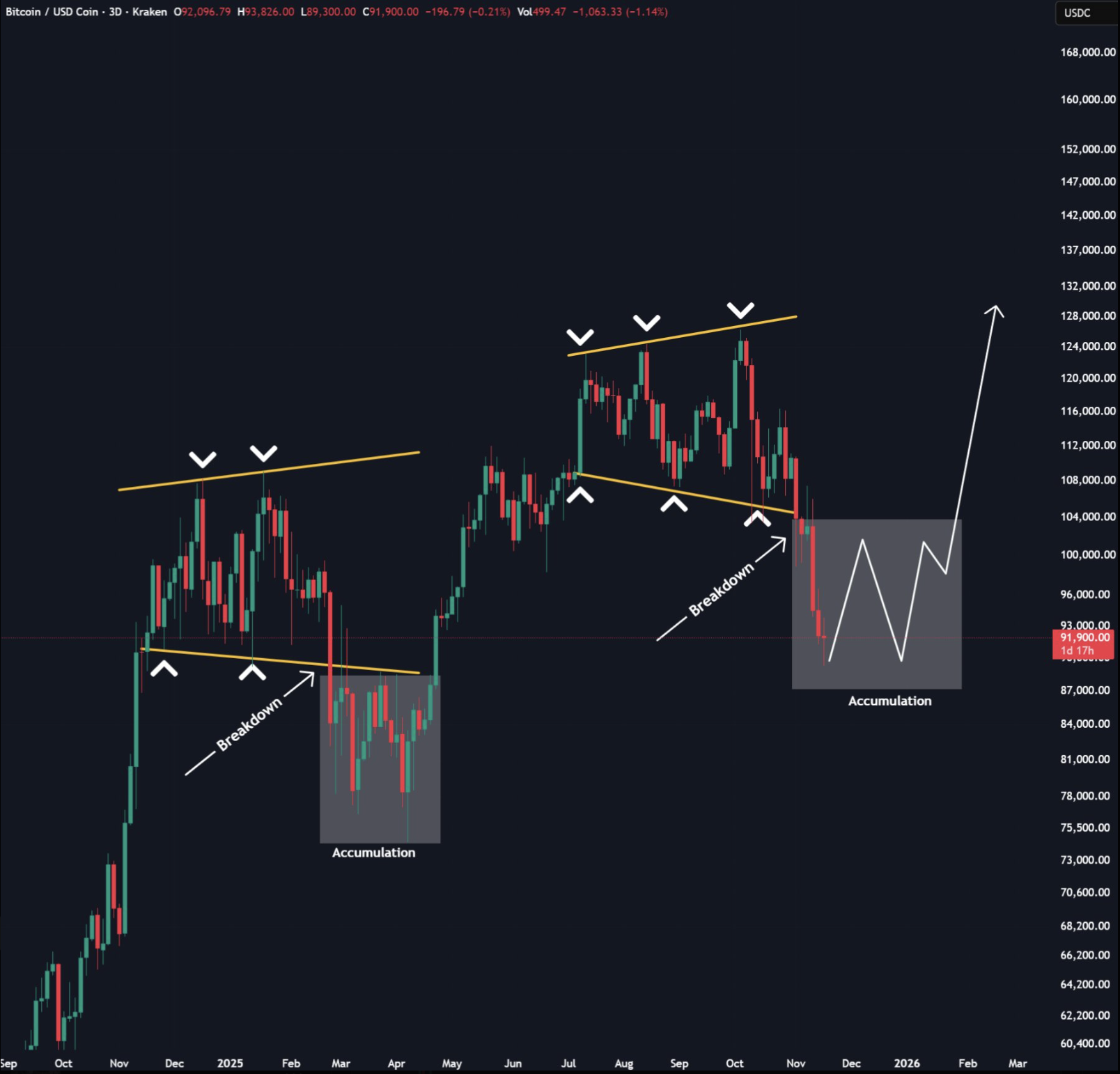في ذلك الوقت، فقدت البيتكوين الزخم بالقرب من أعلى مستوى جديد لها على الإطلاق، وانخفضت إلى ما دون مستوى الدعم الرئيسي، وانفصلت عن سوق الأسهم الصاعد قبل أن تصل إلى القاع في نطاق تراكم لعدة أسابيع.