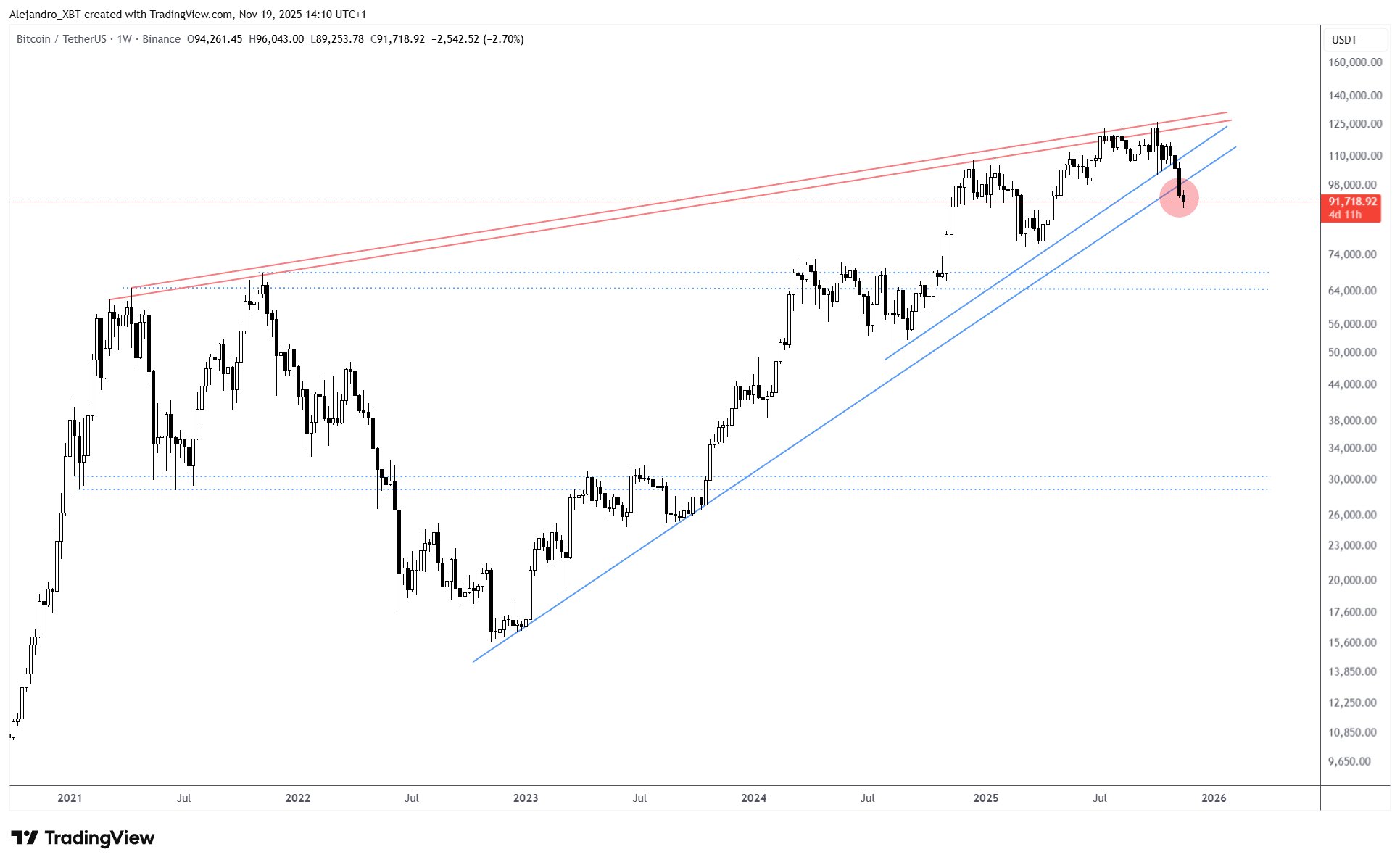 يتخذ المحلل AlejandroBTC موقفًا هبوطيًا أكثر بكثير، مشيرًا إلى أن Bitcoin قد انهار رسميًا من نمط الوتد الصاعد الكبير الذي كان يحذر منه منذ أشهر.