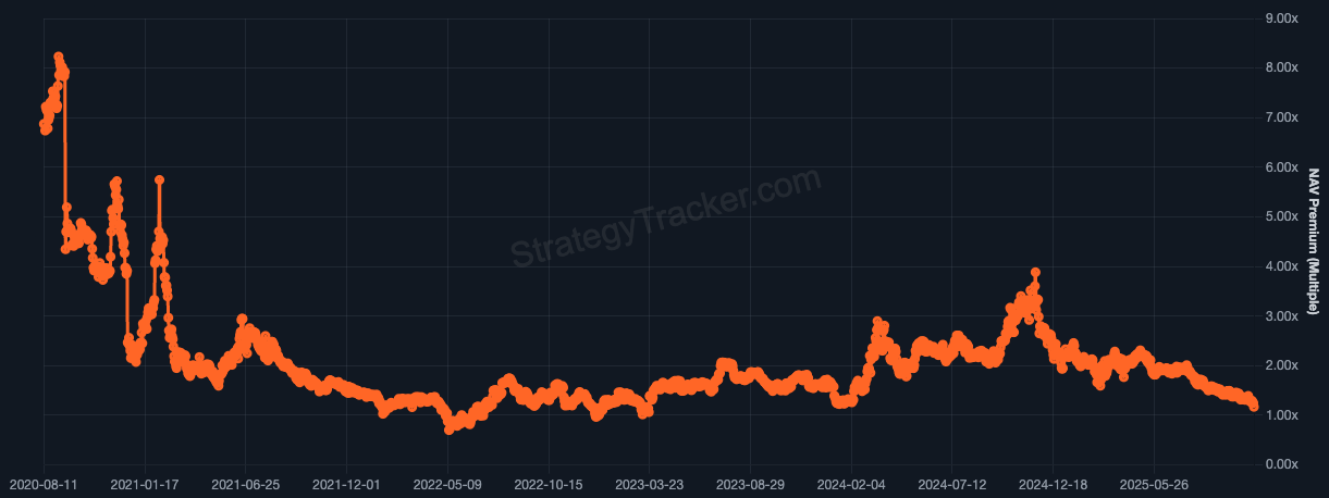 أدى الانخفاض في سعر البيتكوين وأسهم Strategy إلى ضغط قيمة صافي قيمة الأصول (MNAV) إلى 1.05x، حيث انخفض من ذروة بلغت 3.89x في نوفمبر بعد ارتفاع Bitcoin بعد فوز دونالد ترامب في الانتخابات الأمريكية، وفقًا لبيانات StrategyTracker.