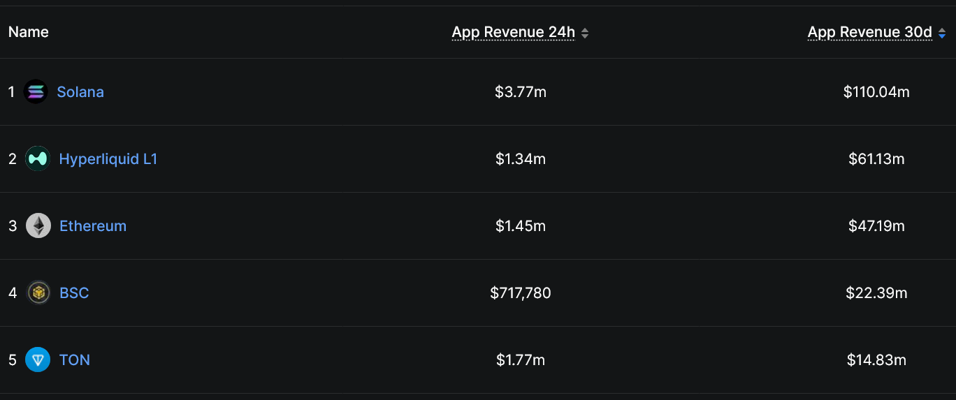 على مدار الثلاثين يومًا الماضية، حصلت على أكثر من 110 مليون دولار، متفوقة بفارق كبير عن Hyperliquid صاحب المركز الثاني بقيمة 61.1 مليون دولار وحوالي ضعف Ethereum البالغة 47.2 مليون دولار، وفقًا لبيانات DeFiLlama.
