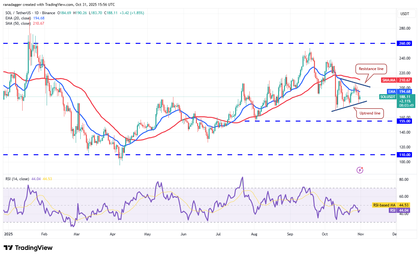 إذا ارتفع السعر من خط الاتجاه الصعودي واخترق فوق المتوسط المتحرك الأسي على مدى 20 يومًا (194 دولارًا)، فهذا يشير إلى أن الزوج قد يبقى داخل المثلث لبعض الوقت. سيعود المشترون إلى مقعد السائق بعد أن يدفعوا سعر Solana فوق خط المقاومة.