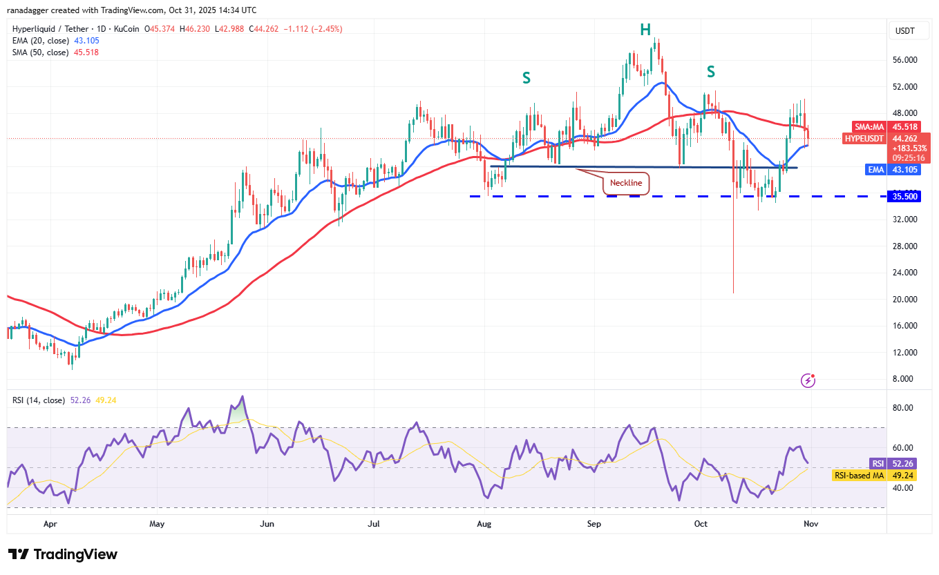 أحبط البائعون مرة أخرى محاولات المضاربين على الارتفاع لدفع سعر Hyperliquid (HYPE) فوق المقاومة العلوية البالغة 51.50 دولارًا يوم الخميس. أدى ذلك إلى انخفاض السعر إلى المتوسط المتحرك الأسي البالغ 20 يومًا (43.10 دولارًا).