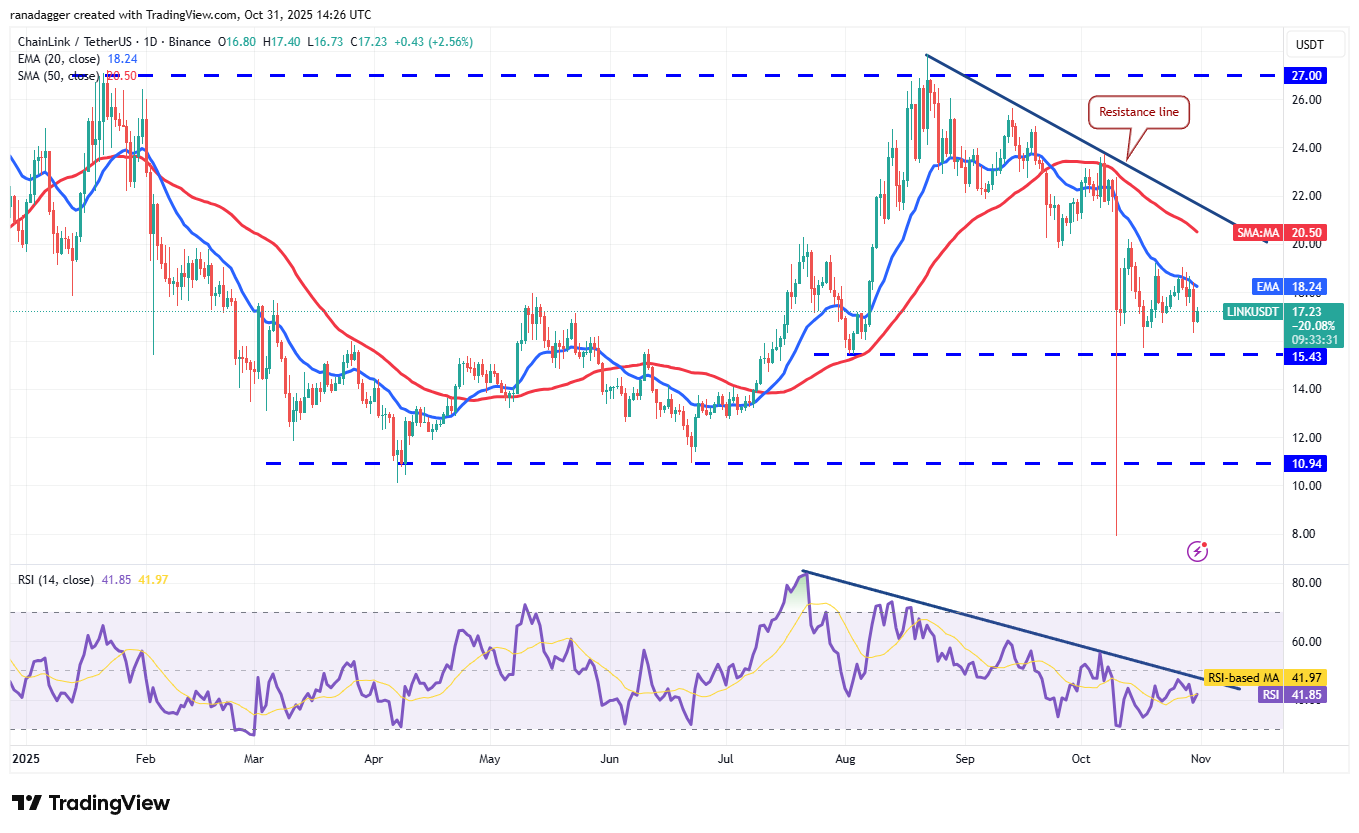 حاول المشترون دفع Chainlink (LINK) فوق المتوسط المتحرك الأسي البالغ 20 يومًا (18.24 دولارًا) يوم الأربعاء، لكن الدببة صمدوا.