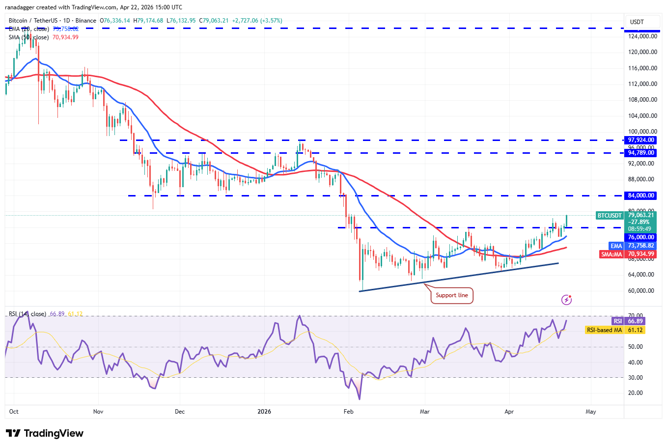 ارتفعت عملة البيتكوين من المتوسط المتحرك الأسي لمدة 20 يومًا (73,758 دولارًا) يوم الاثنين وارتفعت فوق مستوى 78,333 دولارًا يوم الأربعاء، مما يشير إلى ميزة للمضاربين على الارتفاع.