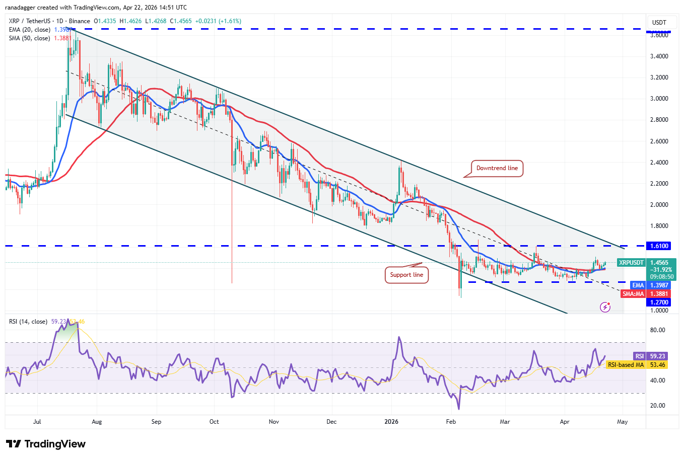 سيحاول المشترون دفع سعر XRP إلى خط الاتجاه الهبوطي لنمط القناة الهابطة، حيث من المتوقع أن يبيع المضاربون على الانخفاض بقوة. إذا انخفض السعر بشكل حاد من خط الاتجاه الهبوطي، فهذا يشير إلى أن زوج XRP/USDT قد يقضي المزيد من الوقت داخل القناة.