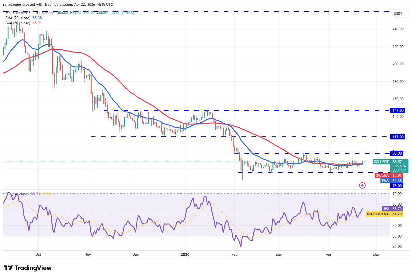 إذا ارتفع السعر فوق 91 دولارًا، فقد يرتفع زوج SOL/USDT إلى المقاومة العلوية عند 98 دولارًا. ومن المتوقع أن يدافع البائعون بقوة عن مستوى 98 دولارًا، ولكن إذا ساد المضاربون على الارتفاع، فقد يصل الاتجاه الصعودي إلى 117 دولارًا.