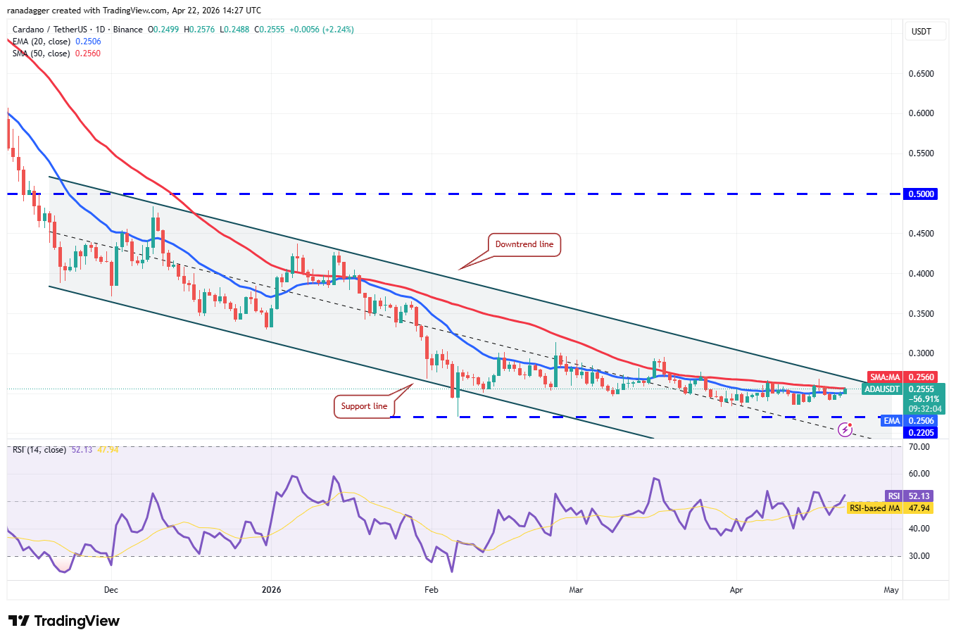 ارتفع Cardano (ADA) إلى منطقة المقاومة القوية بين المتوسط المتحرك البسيط لمدة 50 يومًا (0.26 دولارًا) وخط الاتجاه الهبوطي.