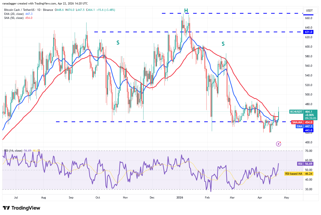 اخترق Bitcoin Cash (BCH) المتوسط المتحرك البسيط لمدة 50 يومًا (454 دولارًا)، مما يشير إلى الطلب القوي عند المستويات الأدنى.