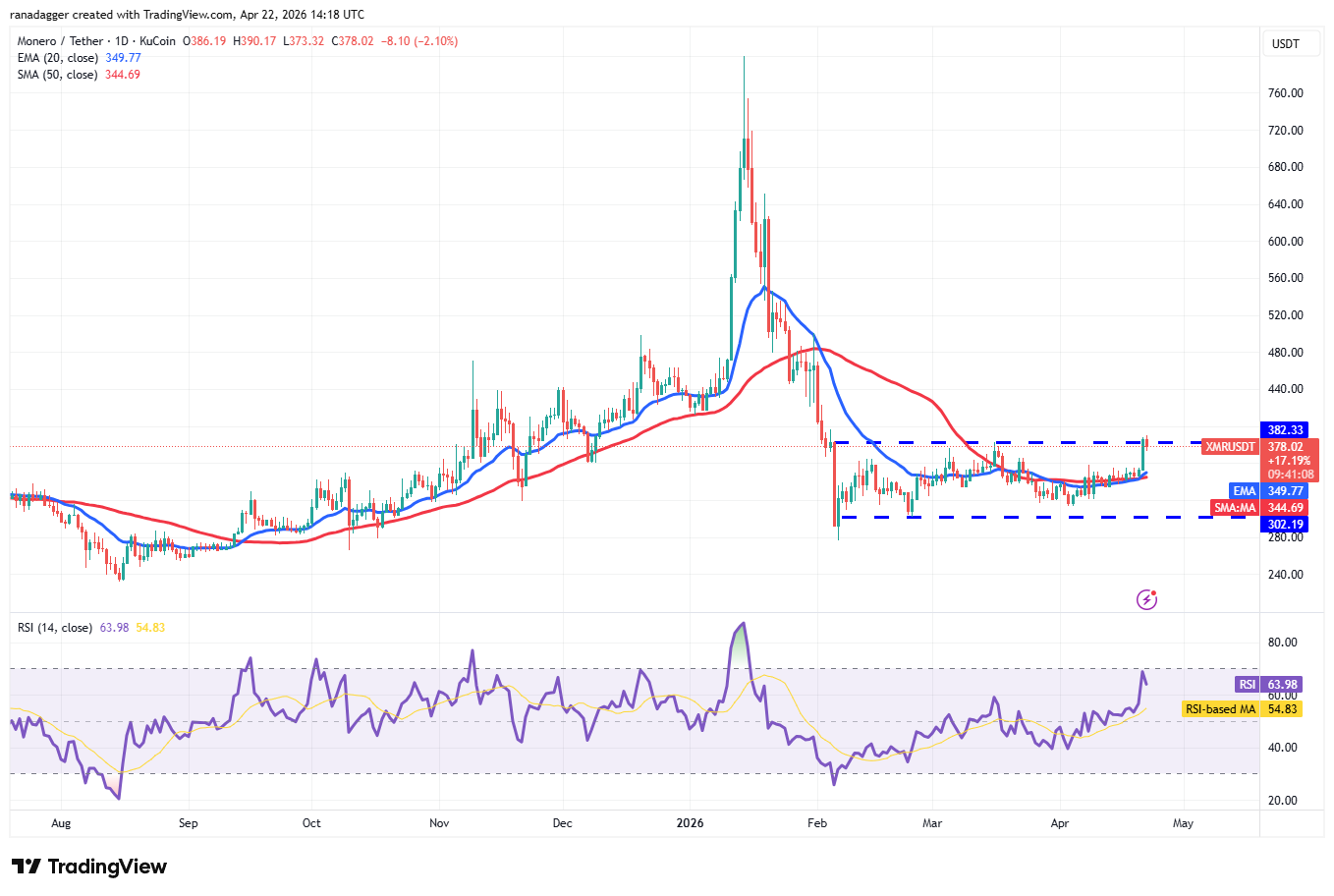 إذا ظل السعر فوق مستوى 382 دولارًا، فقد يبدأ زوج XMR/USDT في اتجاه صعودي جديد نحو هدف النمط عند 462 دولارًا.