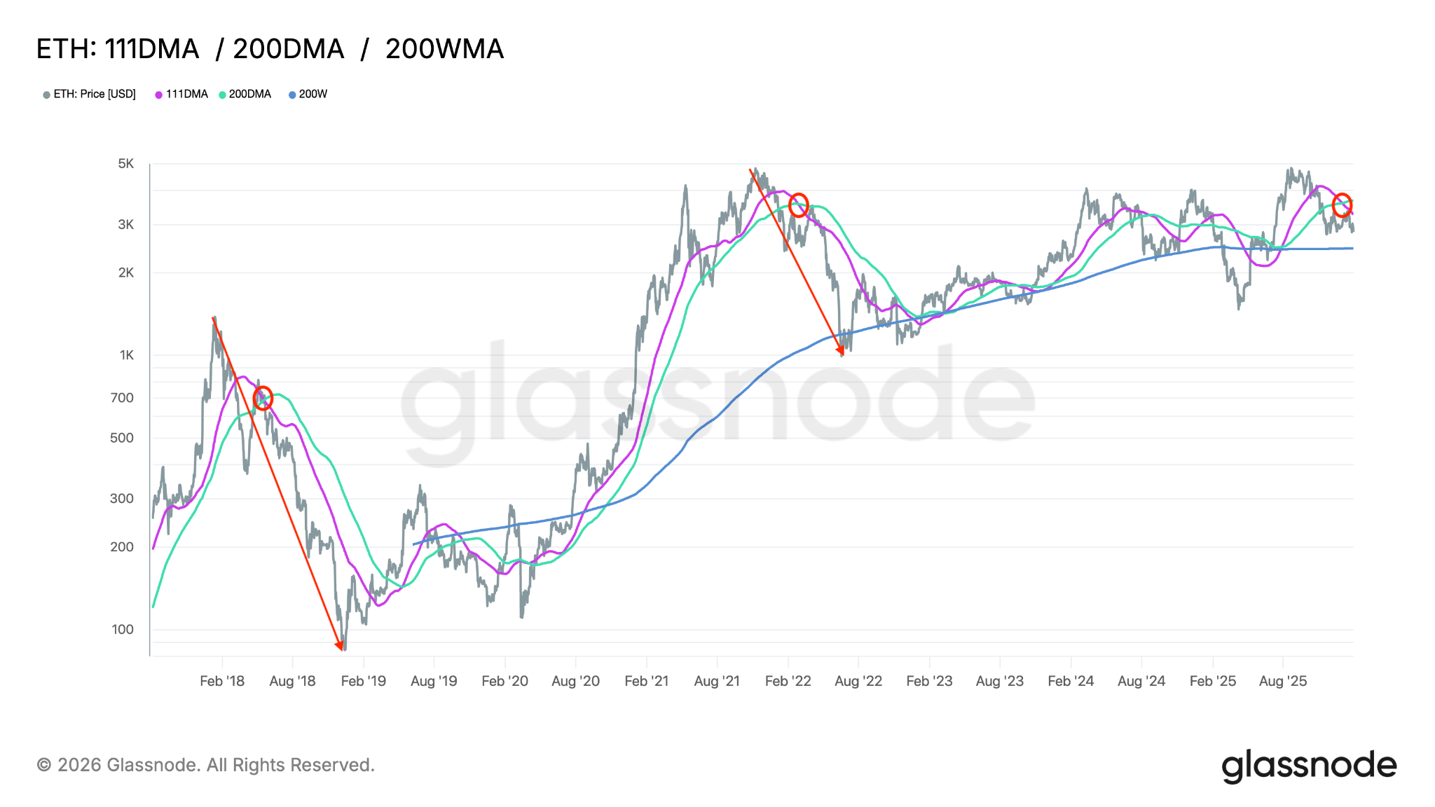 وفي الوقت نفسه، يظهر الرسم البياني الفني أن المتوسط المتحرك لمدة 111 يومًا (MA) يتداول حاليًا تحت المتوسط المتحرك لمدة 200 يوم. أدت عمليات الانتقال المماثلة إلى بدء عمليات سحب أعمق لأسعار ETH خلال الأسواق الهابطة في عامي 2018 و2022، كما هو موضح في الرسم البياني أدناه.