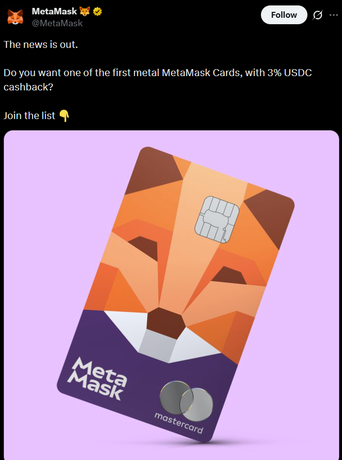 وفي الآونة الأخيرة، أطلقت ماستركارد وميتا ماسك بطاقة أمريكية مرتبطة بالعملات المشفرة تسمح للمستخدمين بإنفاق الأصول الرقمية لدى أي تاجر يقبل ماستركارد، مع تحويل العملات المشفرة إلى عملات ورقية عند نقطة البيع.