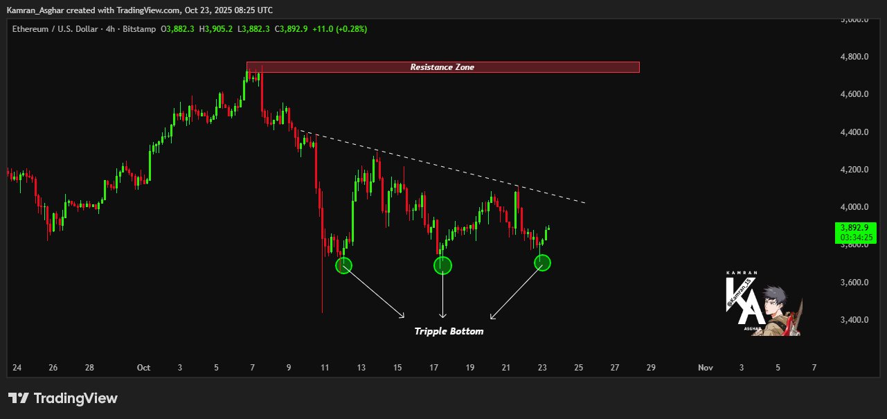 اعتبارًا من يوم الخميس، يُظهر الرسم البياني لـ 4 ساعات لـ Ether قاعًا ثلاثيًا، وهو الإعداد الذي يتشكل عندما تصل الأسعار إلى نفس مستوى الدعم ثلاث مرات وتفشل في الاختراق للأسفل في كل مرة.