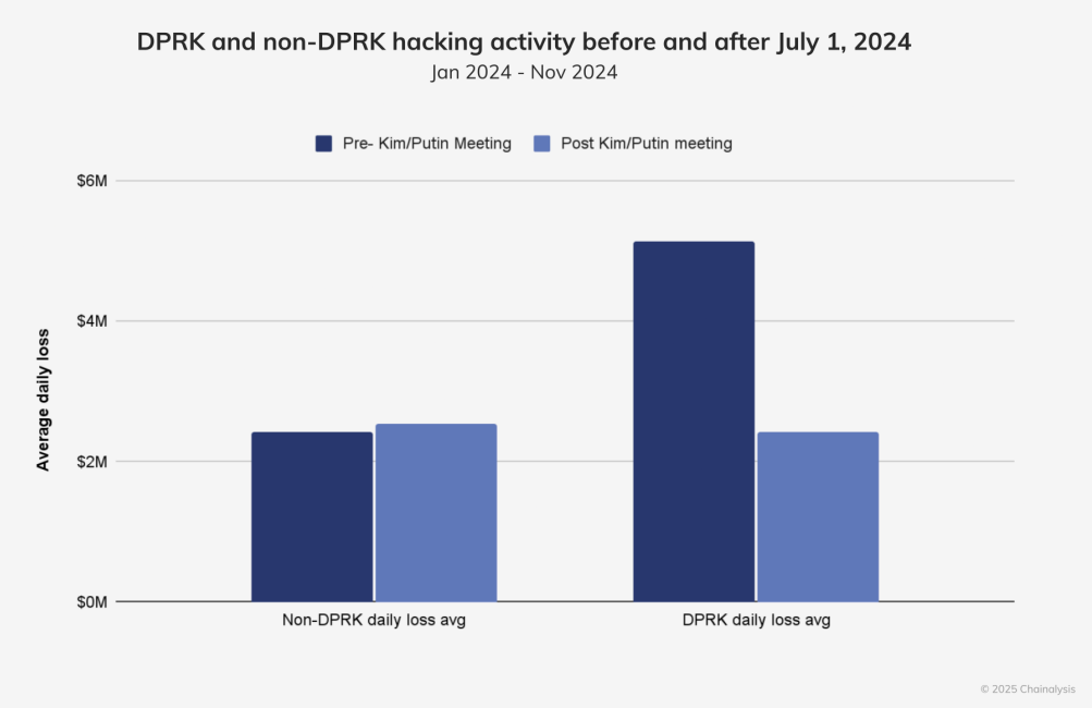 وفقًا لشركة تحليلات بلوكتشين تشيناليسيس، انخفض النشاط غير المشروع المرتبط بالجهات السيبرانية الكورية الشمالية بشكل حاد بعد ١ يوليو ٢٠٢٤، على الرغم من تصاعد الهجمات في وقت سابق من ذلك العام.