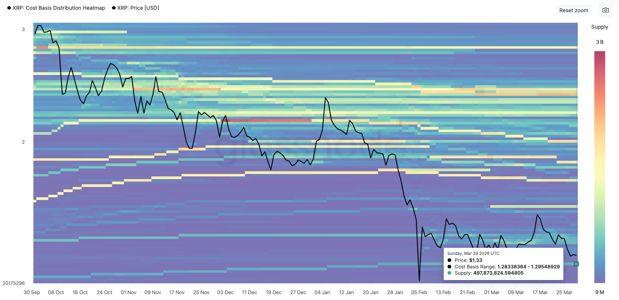 يتم تعزيز أهمية مستوى الدعم هذا من خلال التوزيع على أساس التكلفة. تُظهر الخريطة الحرارية أدناه أنه تم الحصول على ما يقرب من 500 مليون XRP بهذا السعر.