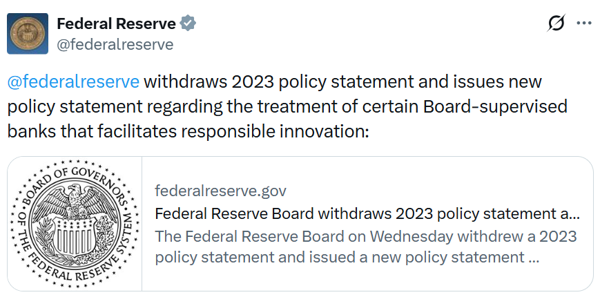 قام بنك الاحتياطي الفيدرالي الأمريكي بسحب توجيهات عام 2023 التي حدت من كيفية تعامل البنوك التي يشرف عليها بنك الاحتياطي الفيدرالي، بما في ذلك البنوك غير المؤمنة، مع العملات المشفرة، حيث يواصل المنظمون الأمريكيون التركيز بشكل إيجابي نحو الأصول الرقمية.