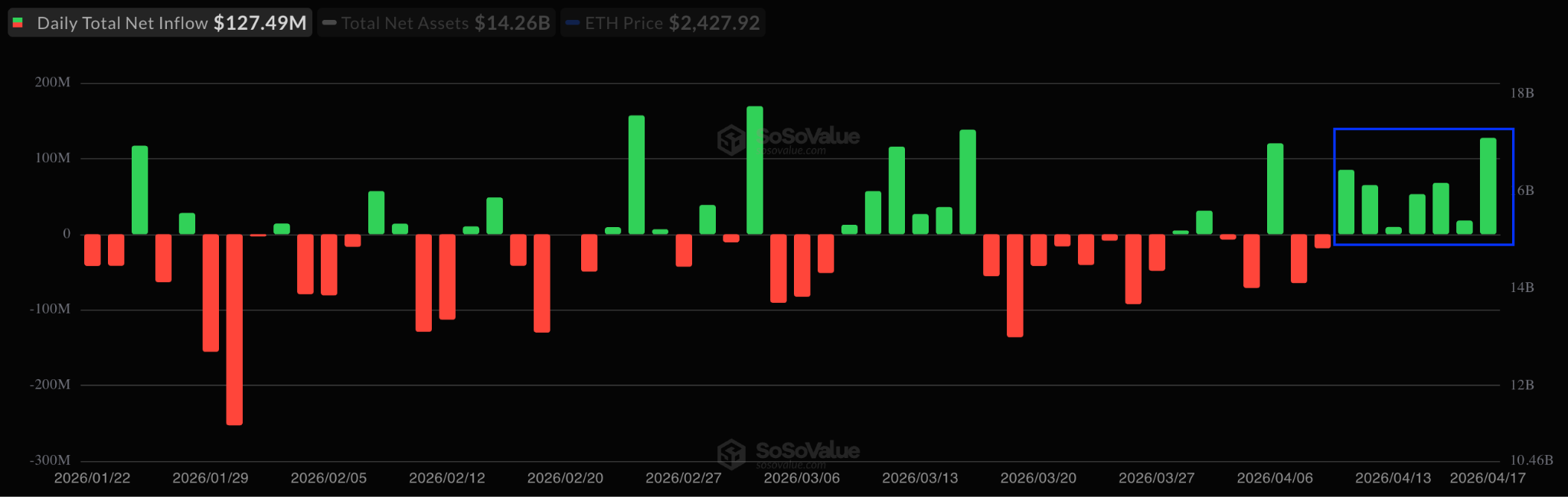 وفي الوقت نفسه، سجلت منتجات الاستثمار العالمية في إيثريوم تدفقات واردة بقيمة 328 مليون دولار خلال الأسبوع المنتهي في 17 أبريل.