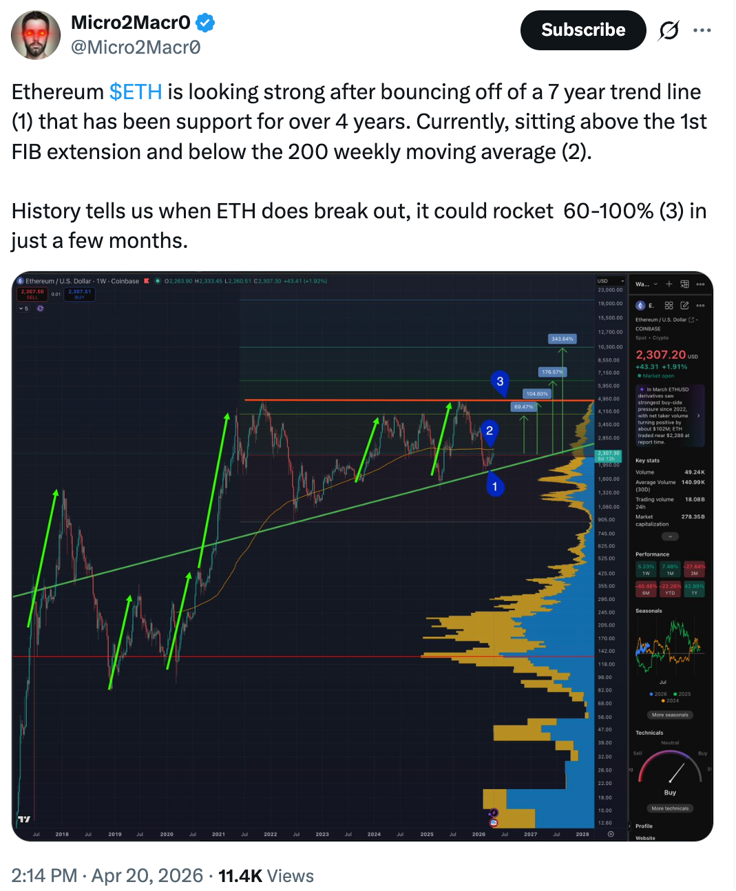 بالتصغير، قال المحلل Micro2Macr0 إن الاختراق من المثلث الصاعد متعدد السنوات يمكن أن يؤدي إلى ارتفاع أسعار ETH بنسبة 60٪ -٪ 100٪.
