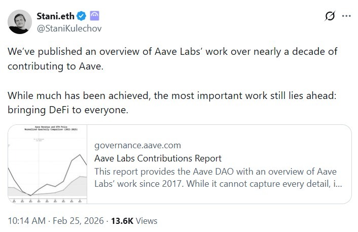 قالت Aave Labs إن عدد مقترحات الحوكمة أو مشاركات المنتديات لا يعكس النطاق الكامل لأعمال البحث والتطوير والأمن والبنية التحتية اللازمة للحفاظ على البروتوكول الذي يستخدمه ملايين المستخدمين.