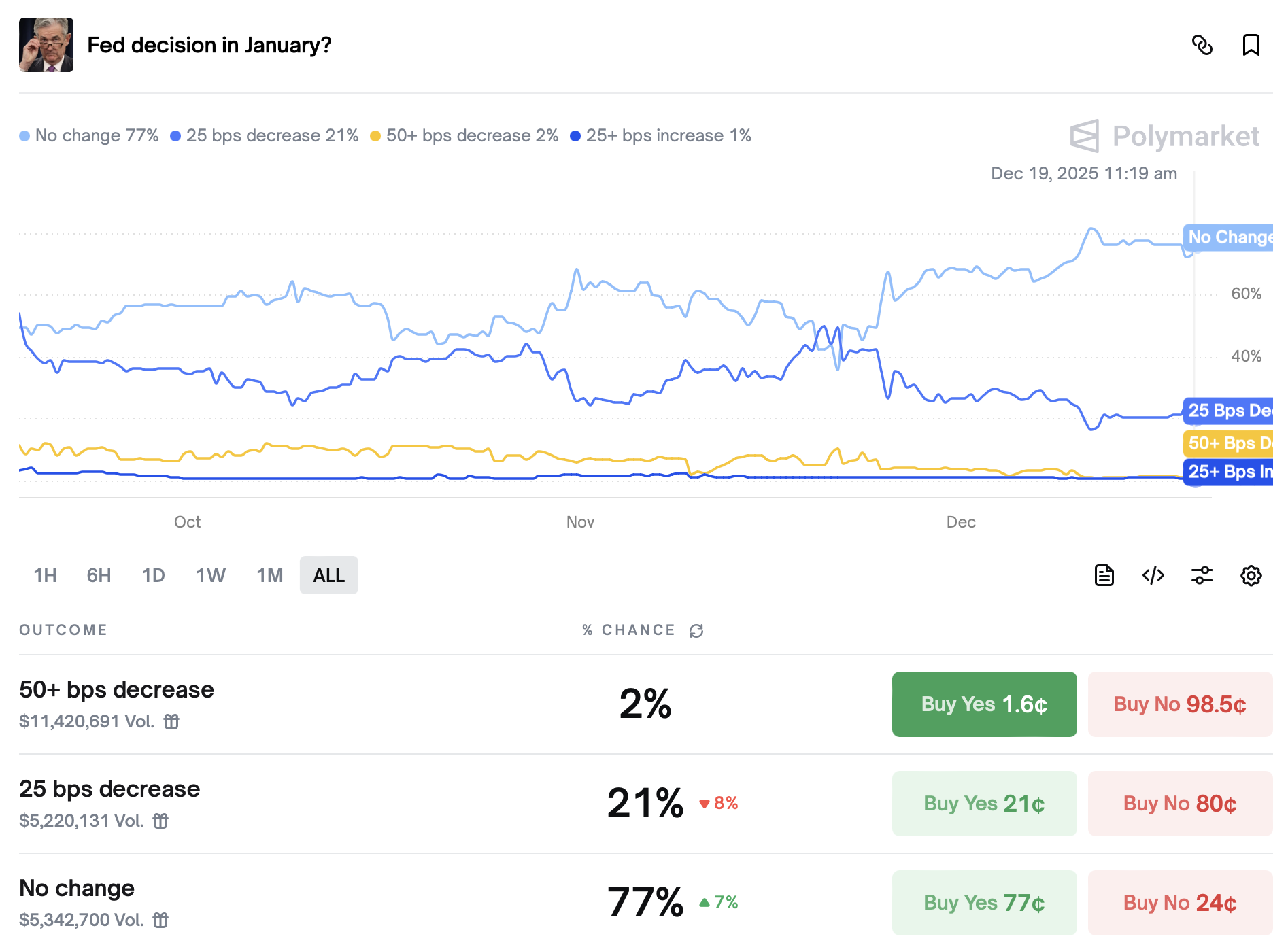 في وقت كتابة هذا التقرير، كان متداولو Polymarket يتوقعون بأغلبية ساحقة عدم حدوث تغيير في سياسة بنك الاحتياطي الفيدرالي في يناير، مع احتمال بقاء أسعار الفائدة دون تغيير عند حوالي 77٪، في حين أن احتمالات خفض 25 نقطة أساس أخرى تقترب من 21٪ ويُنظر إلى التحركات الأكبر على أنها غير مرجحة إلى حد كبير.