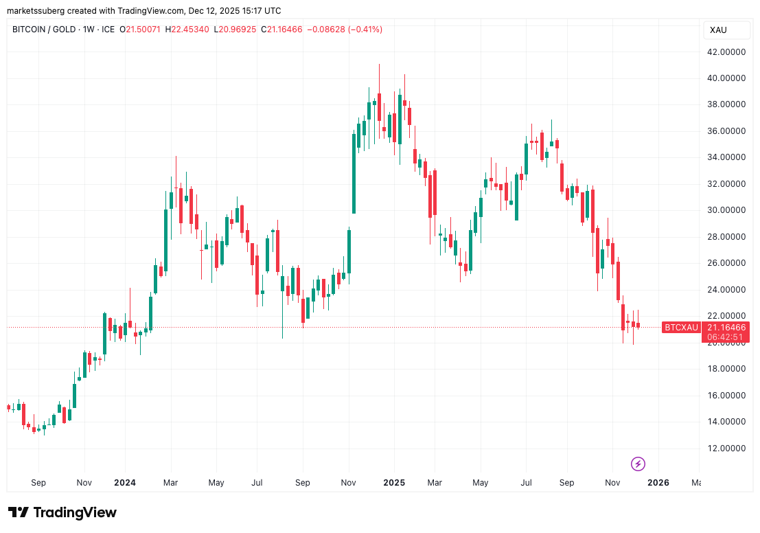 عند الافتتاح الشهري لشهر ديسمبر، وصلت عملة البيتكوين إلى أدنى مستوياتها مقابل الذهب منذ أوائل عام 2024.