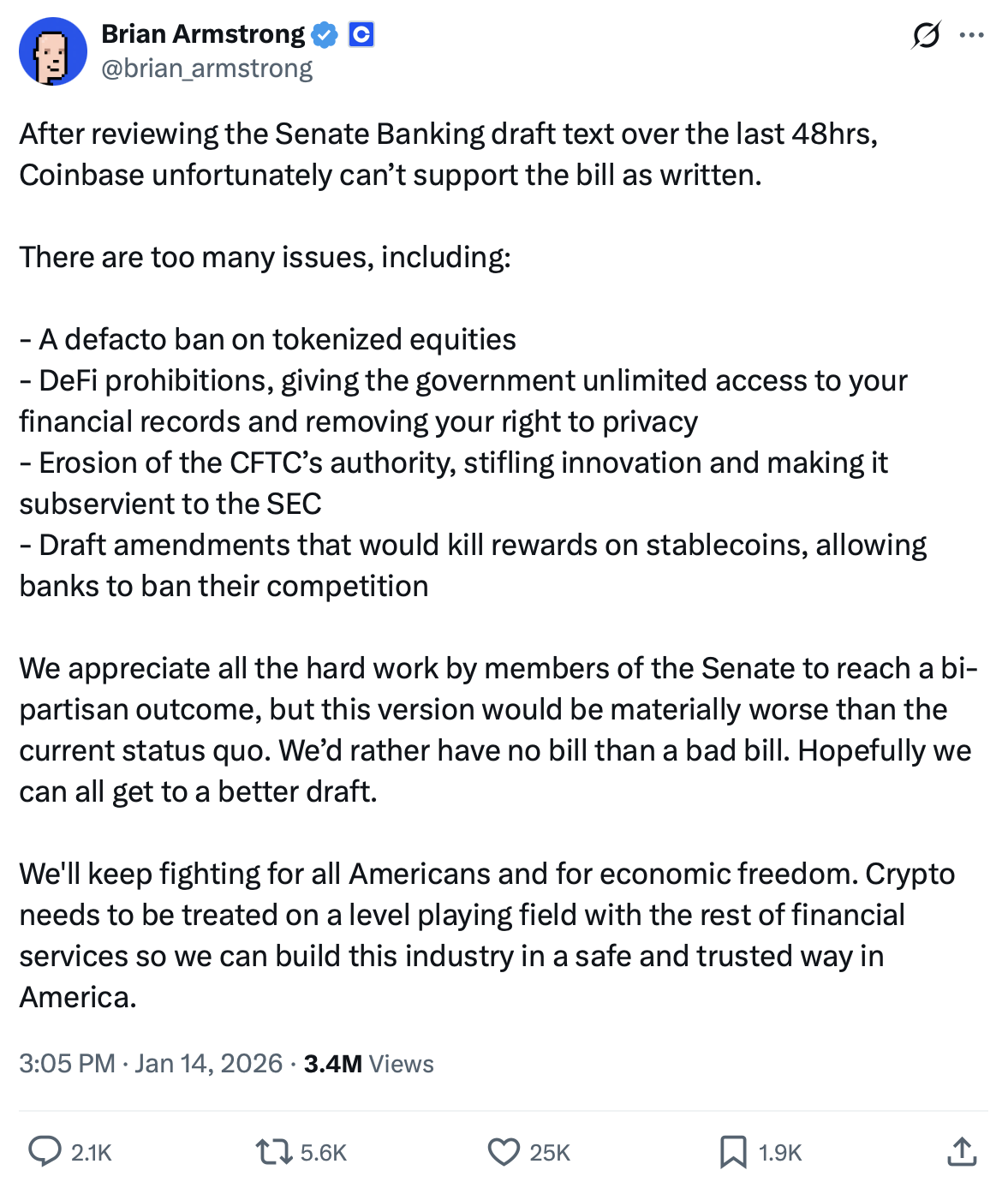 قال الرئيس التنفيذي لشركة Coinbase، بريان أرمسترونج، على X إن هناك “العديد من المشكلات” في المسودة الحالية لمشروع القانون لدعمها، بما في ذلك إلغاء عوائد العملات المستقرة مع عزل البنوك عن المنافسة.