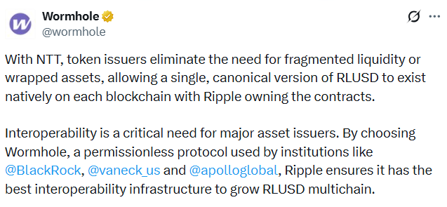 وأضاف فريق Wormhole: “باستخدام NTT، يلغي مصدرو الرمز المميز الحاجة إلى سيولة مجزأة أو أصول ملفوفة، مما يسمح بوجود نسخة أساسية واحدة من RLUSD أصلاً على كل blockchain مع امتلاك Ripple للعقود”.