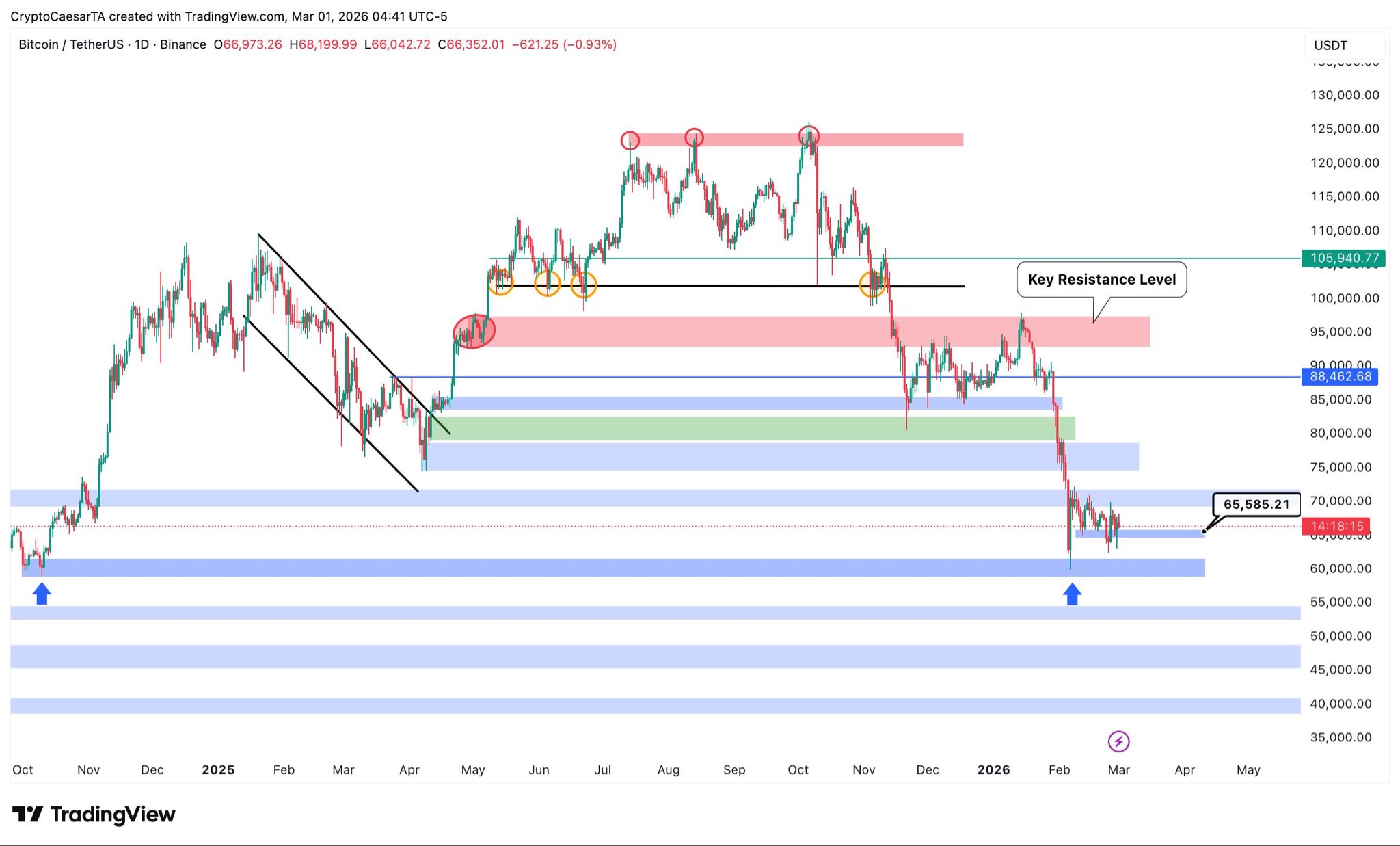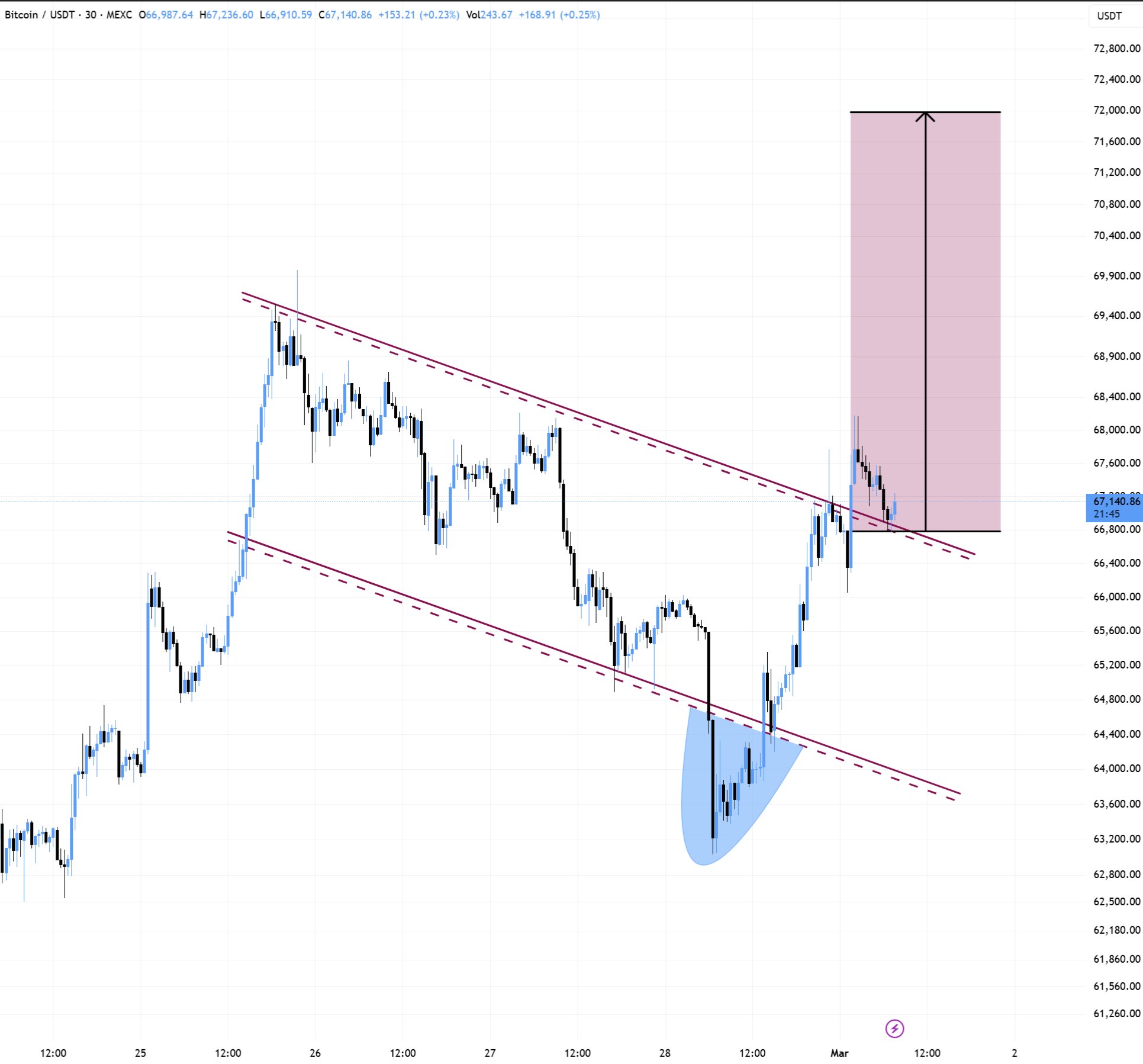 “الانحراف إلى ما دون منطقة الدعم أدى الآن إلى تحويل المقاومة إلى دعم. أعتقد أن الارتفاع نحو مستوى 73 ألف دولار – 74 ألف دولار قد يحدث.”