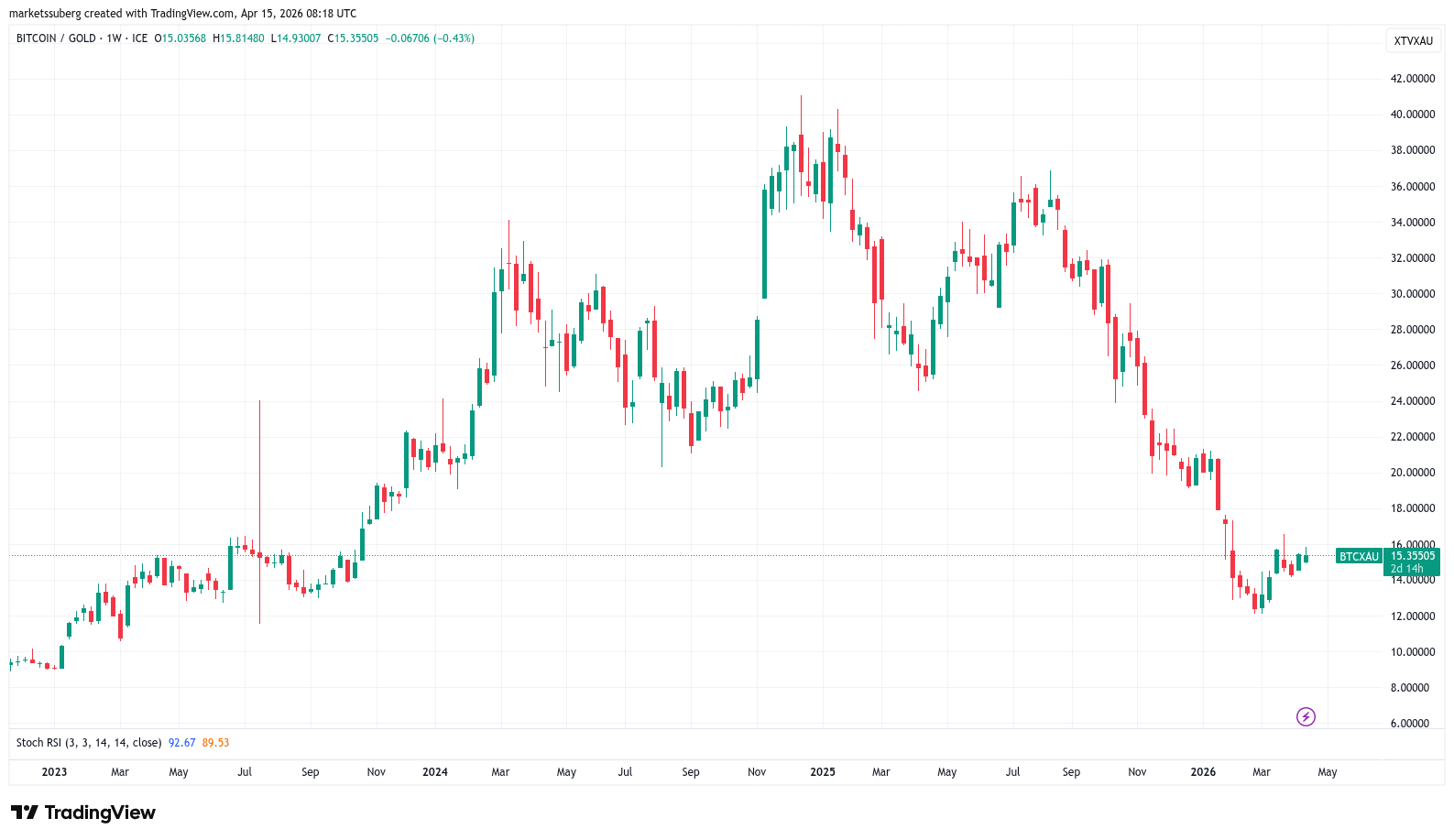 وأشار إلى أن “التصحيح الأخير لسعر البيتكوين مقابل الذهب هو الأثقل في تاريخ البيتكوين”.