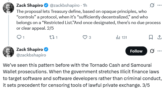 قال تشيرفينسكي: “إنه أمر سيء للغاية. إنه لا ينظم العملات المشفرة، بل يحظرها”، مشيرًا إلى إجراء مقترح يسمح لوزارة الخزانة بإنشاء “قائمة مقيدة” لبروتوكولات التمويل اللامركزي التي تعتبرها محفوفة بالمخاطر للغاية.