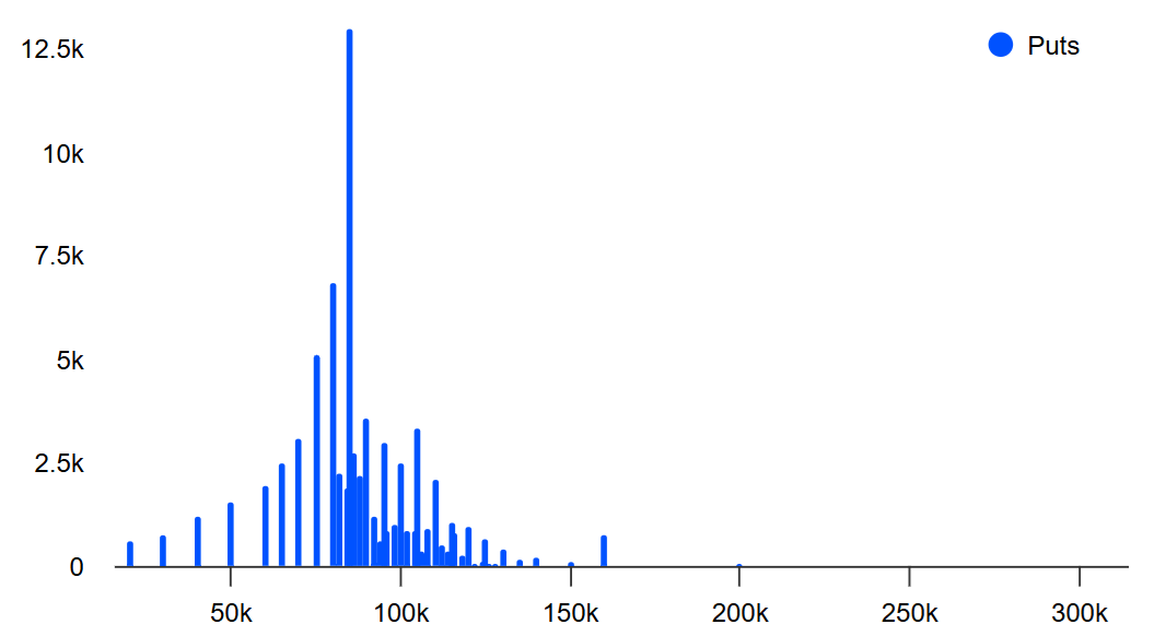 وحتى باستثناء 2.5 مليار دولار من الفوائد المفتوحة بأسعار الإضراب البالغة 150 ألف دولار أو أعلى، تظهر البيانات تركيزا كبيرا بين 100 ألف دولار و 125 ألف دولار. غالبا ما يستخدم المتداولون أسعار الإضراب المتفائلة للغاية لجمع علاوة التقلب من خلال استراتيجيات المكالمة المغطاة، وهو ما يفسر الطلب القوي على مستويات تصل إلى 200،000 دولار.