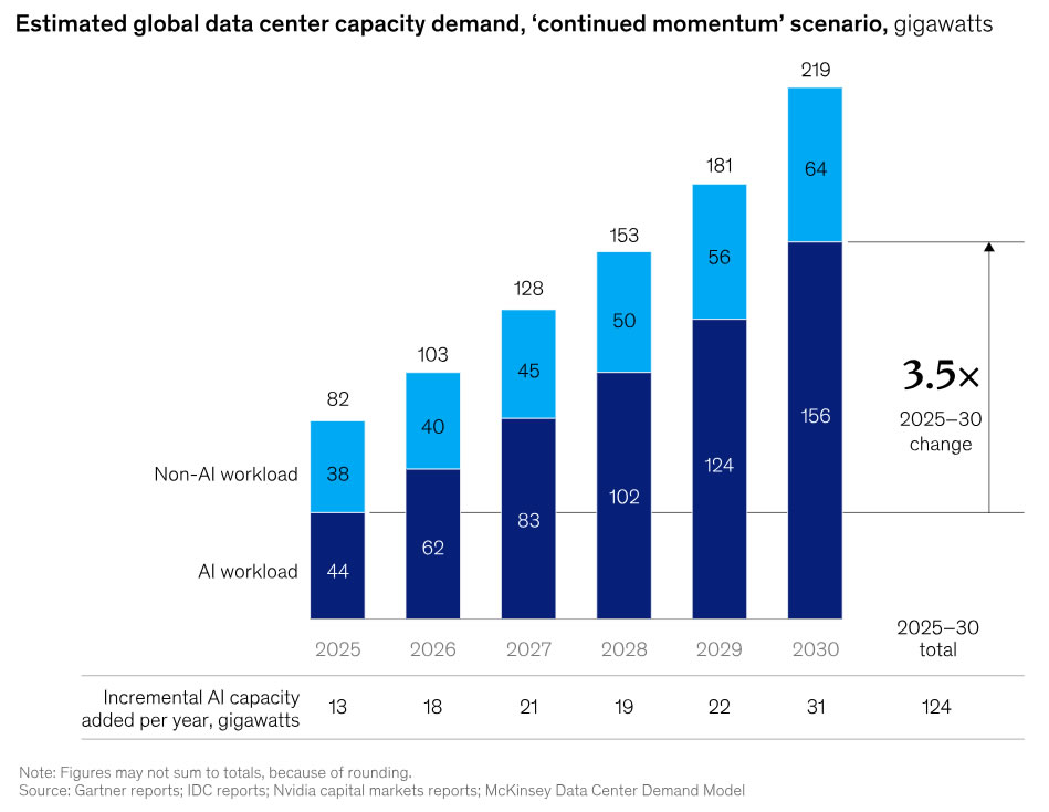 “إن طلب تحطيم السجلات من الذكاء الاصطناعى هو إيجاد قيود في توريد مراكز البيانات والكهرباء حيث تكافح شركات الذكاء الاصطناعى للوصول إلى الربحية وسط تكاليف التثبيت. تقدر المؤسسات أن الذكاء الاصطناعى ستقود زيادة بنسبة 165 ٪ في الطلب على مراكز البيانات بحلول عام 2030”.