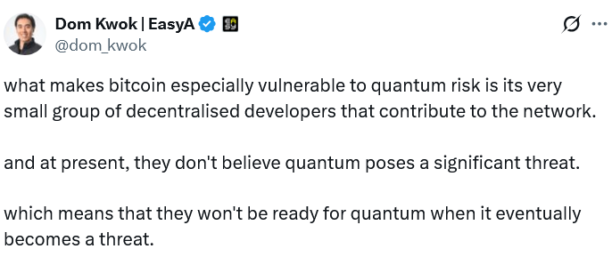 يعتقد بعض مستخدمي البيتكوين، مثل الرئيس التنفيذي للاستراتيجية مايكل سايلور والرئيس التنفيذي لشركة Blockstream آدم باك، أن التهديدات الكمومية مبالغ فيها ولن تعطل الشبكة لعقود من الزمن.