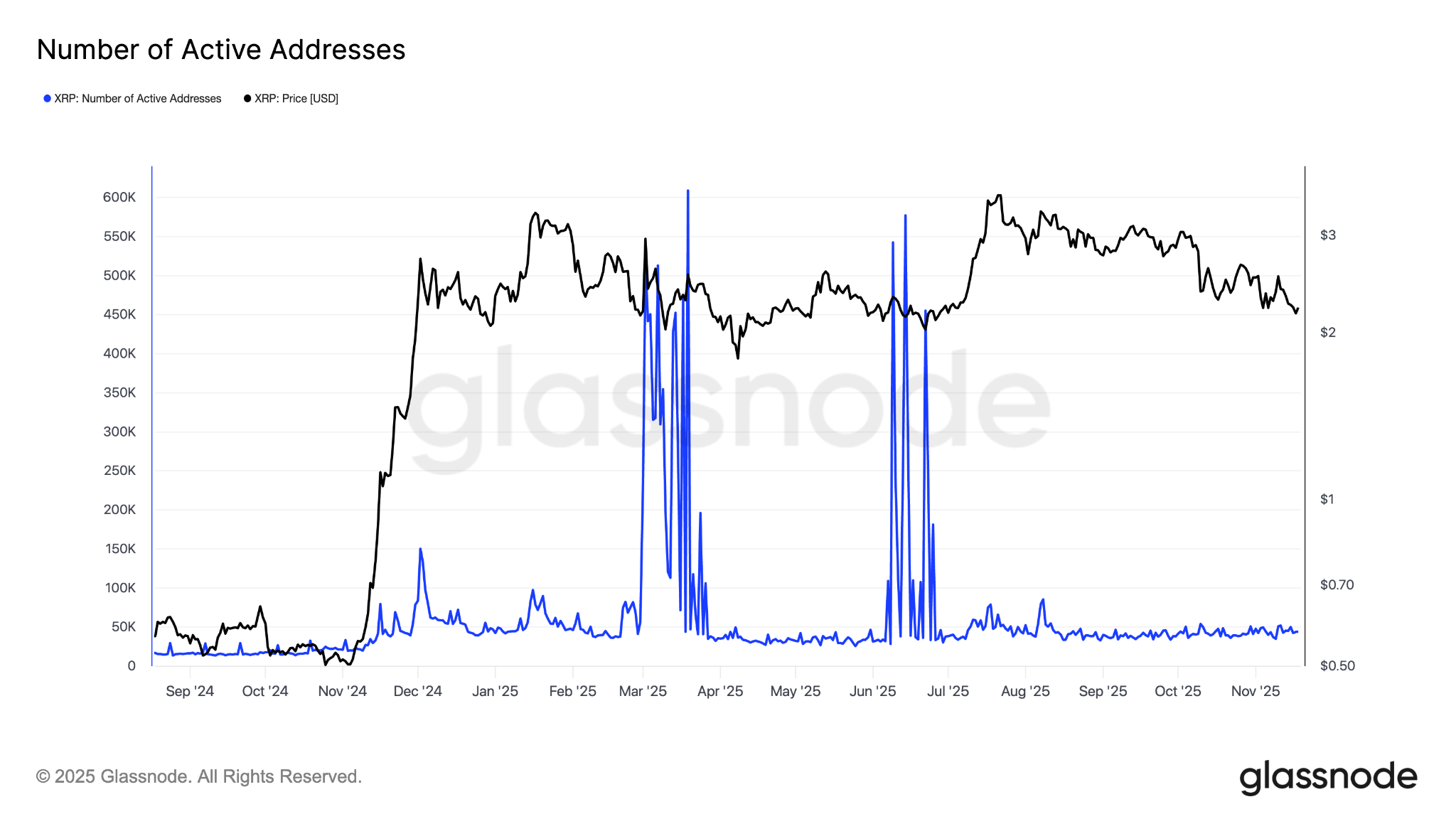 تشير العناوين النشطة اليومية المنخفضة إلى نشاط الشبكة والسيولة الخافتة، مما يؤدي إلى تضخيم مخاطر بيع XRP.